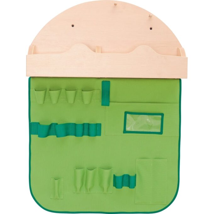 Mit 2 Fächern und 2 Haken; aus laminierter Spanplatte in Birke-Optik; Wandbehang aus grüner Baumwolle mit verschiedenen Taschen; Schlaufen mit Klettverschluss zum Befestigen der Instrumente; passendes Set mit Instrumenten für 16 Kinder (199212) – separat bestellbar.