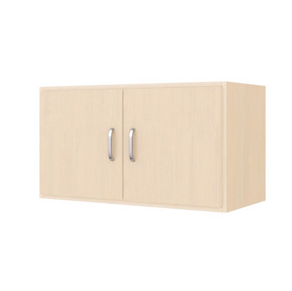 Erhältlich in zwei Größen – 80 x 39 x 44 cm und 80 x 39 x 73 cm – lässt sich der Schrank individuell an die Raumhöhe und den vorhandenen Platz anpassen. Mit seinem hellen Ahorn-Melamin-Dekor und der klaren Linienführung fügt er sich nahtlos in jede Umgebung ein und schafft eine warme, natürliche Atmosphäre.