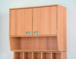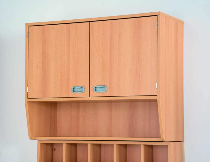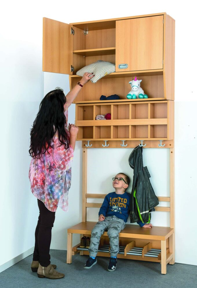 Nutzen Sie den oft ungenutzten Platz über der Garderobe und verwandeln Sie ihn in wertvollen, organisierten Stauraum. Unser Hängeschrank ist die perfekte Erweiterung für bestehende Garderobenanlagen in Krippen, Kindergärten und Schulen. Er schafft mühelos Ordnung, indem er eine intelligente Kombination aus geschlossenem Schrankraum und einem offenen, schnell zugänglichen Fach bietet. Ob für saisonale Kleidung, Bastelmaterialien oder Rucksäcke – dieses Möbelstück nutzt die Raumhöhe optimal aus und hält gleichzeitig den Boden frei. Durch sein klares Design und die robuste Bauweise fügt er sich nahtlos in jede Umgebung ein und sorgt für eine aufgeräumte, ruhige Atmosphäre im Eingangsbereich.