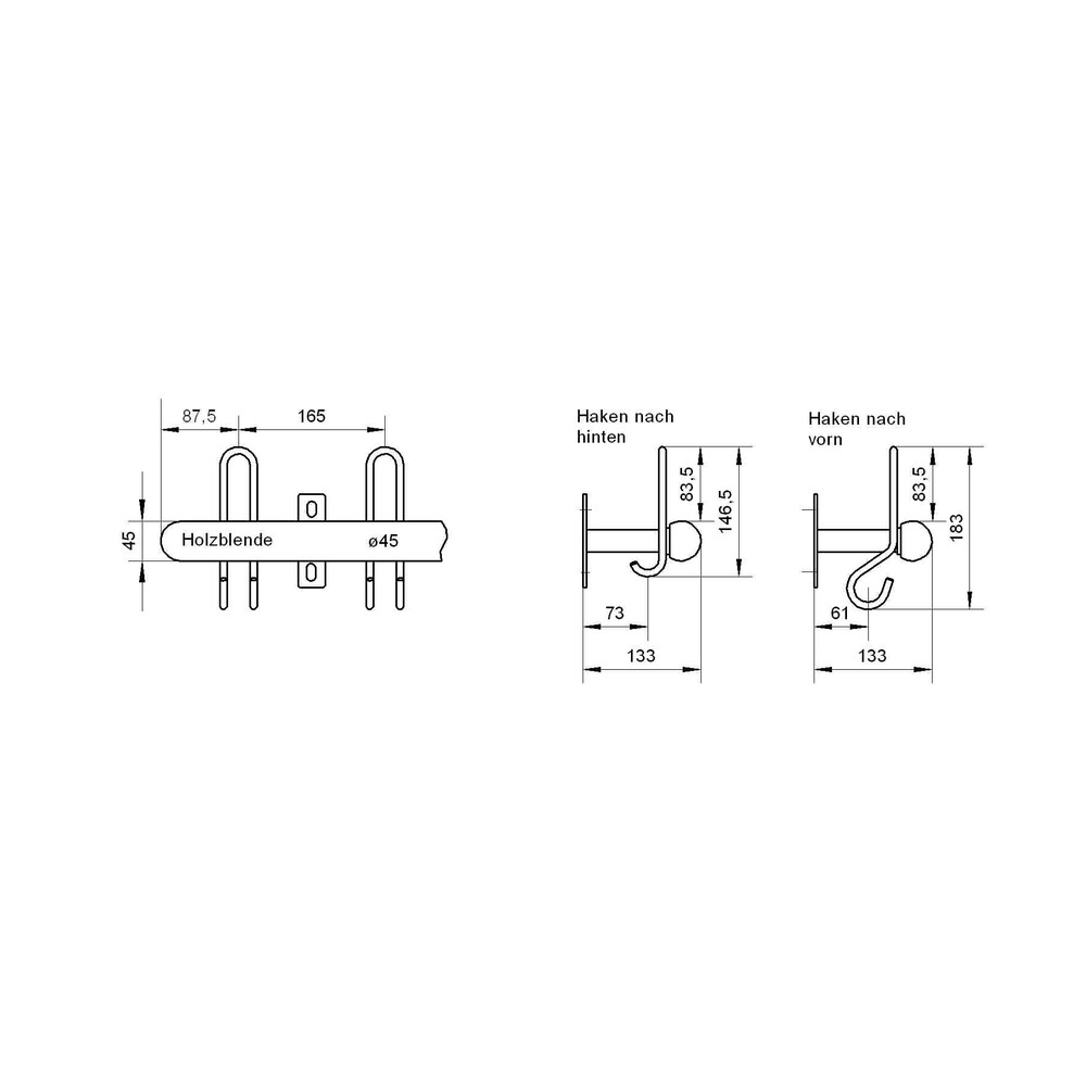 - Material: Buche-Blende (45 mm) mit Kugelenden, Hakenträger aus verschweißtem Stahl