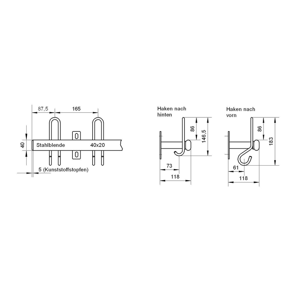 - Haken: 8 mm Rundstahl, abgeschirmt, Abstand 16,5 cm