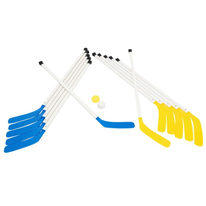 Das Set enthält zwölf Hockey-Schläger – sechs mit gelber und sechs mit blauer Schaufel – sowie einen Puck und einen Ball. Mit einer Länge von 95 cm sind die Schläger speziell für ältere Schüler und Jugendliche mit einer Körpergröße zwischen 160 und 190 cm ausgelegt. Die austauschbaren Schaufeln bieten zusätzliche Flexibilität und stellen sicher, dass die Schläger auch bei intensivem Einsatz lange genutzt werden können.