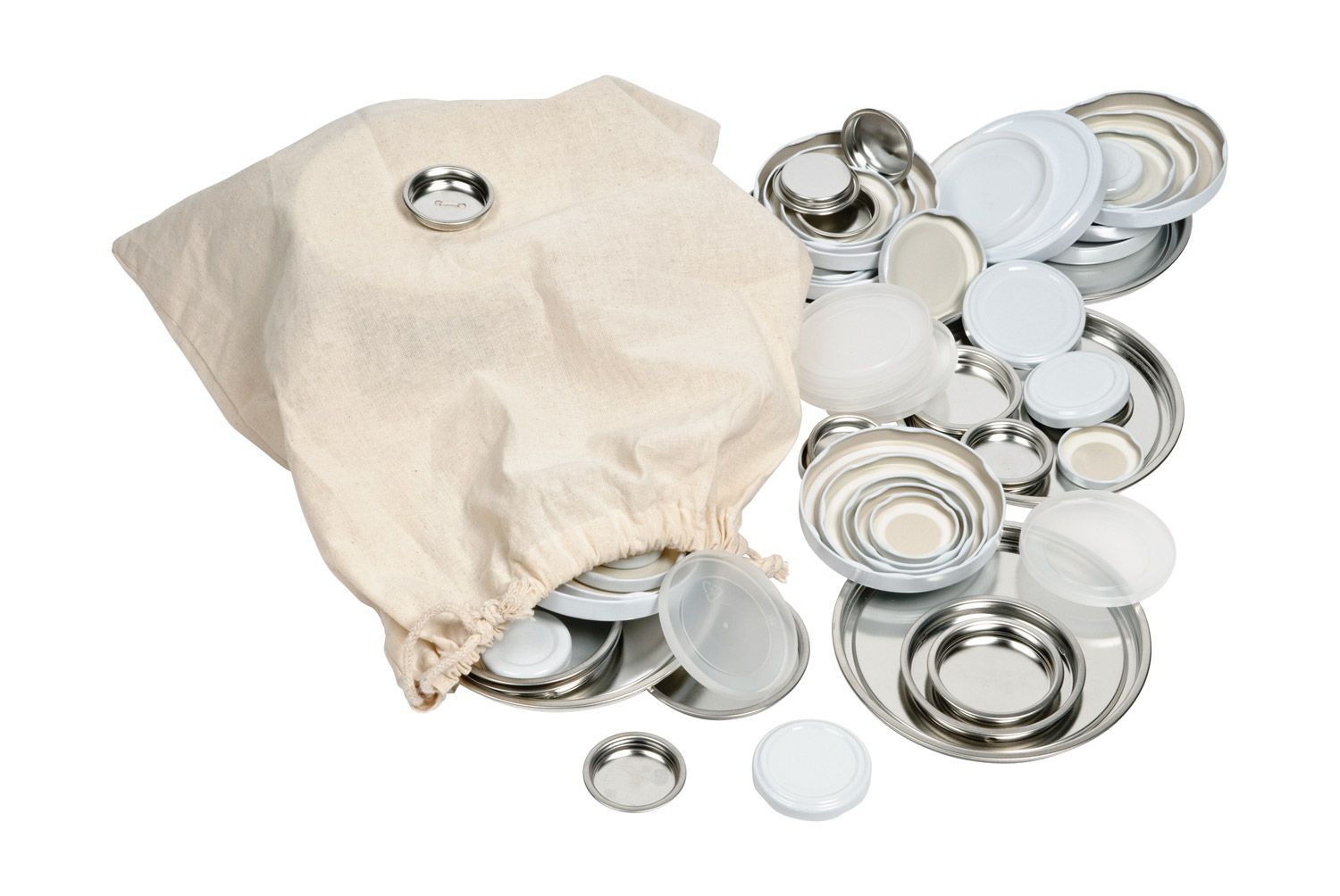 Die Deckel sind aus Kunststoff und Stahlblech hergestellt, was sie robust und langlebig macht. Sie sind sicher für kleine Hände und damit ideal für die Nutzung bei intensiven Spielen in Krippen, Kindergarten und zu Hause. Das Set wird in einem pratischen Baumwollbeutel (100 % Baumwolle) geliefert, der eine einfache Aufbewahrung und einen bequemen Transport ermöglicht.