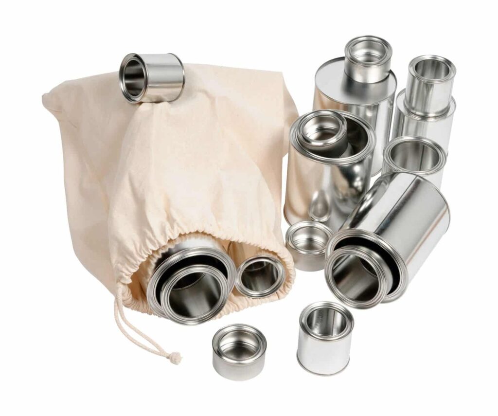 Die Dosen sind robust und kinderfreundlich gestaltet, wodurch sie für den regelmäßigen Gebrauch in Kitas und zu Hause bestens geeignet sind. Die Verpackung in einem Baumwollbeutel (100 % Baumwolle) sorgt für eine ordentliche Aufbewahrung und einen einfachen Transport der Dosen.