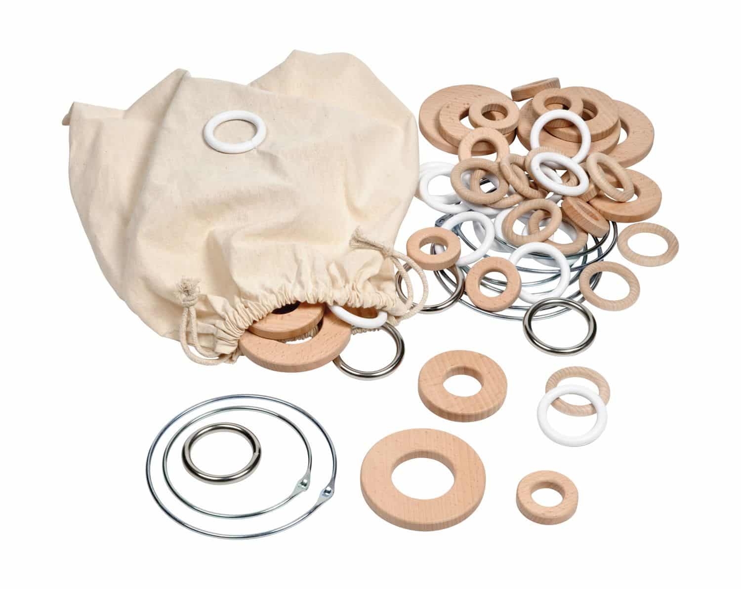 Kleine Kinder machen ihre ersten Erfahrungen mit der Welt, indem sie Dinge untersuchen und erkunden. Mit den 66 unterschiedlich großen Ringen und Scheiben (Durchmesser von 4,5 bis 15 cm) aus Holz, Kunststoff, Eisen und Edelstahl können die Kinder ihre Fantasie und Kreativität entfalten. Die verschiedenen Materialien laden dazu ein, die Ringe spielerisch in eine große Dose zu stecken und wieder herauszunehmen. Dabei wird die Sinneswahrnehmung geschärft, während sie die klangvollen Geräusche und die unterschiedlichen Texturen entdecken.