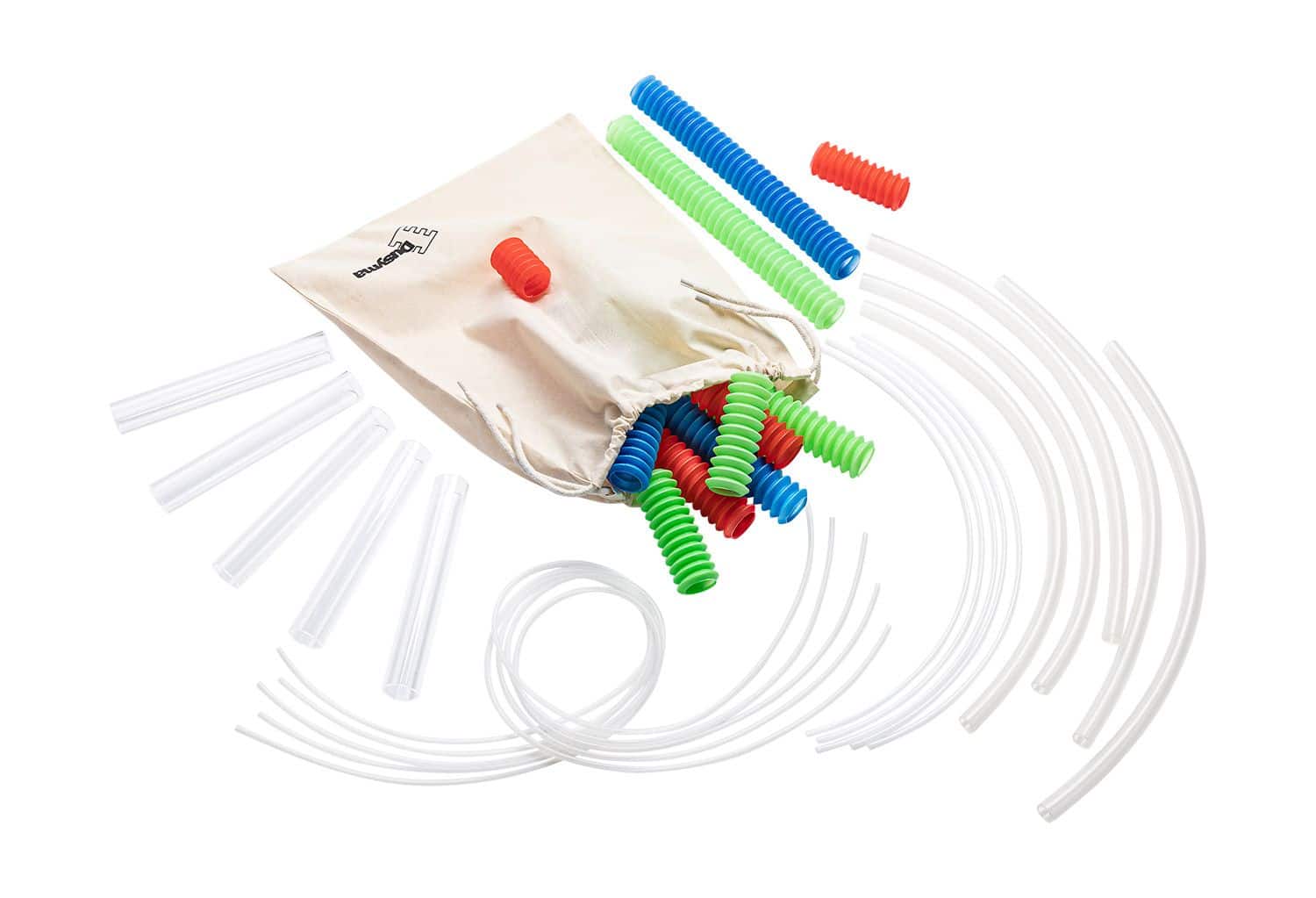 Die Schläuche bestehen aus hochwertigem Kunststoff und Silikon, die Flexibilität und Haltbarkeit bieten. Dieses Spielset wird in einem praktischen Baumwollbeutel (100 % Baumwolle) geliefert, der eine einfache Aufbewahrung und einen bequemen Transport ermöglicht.