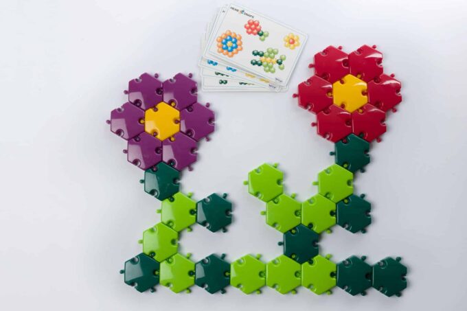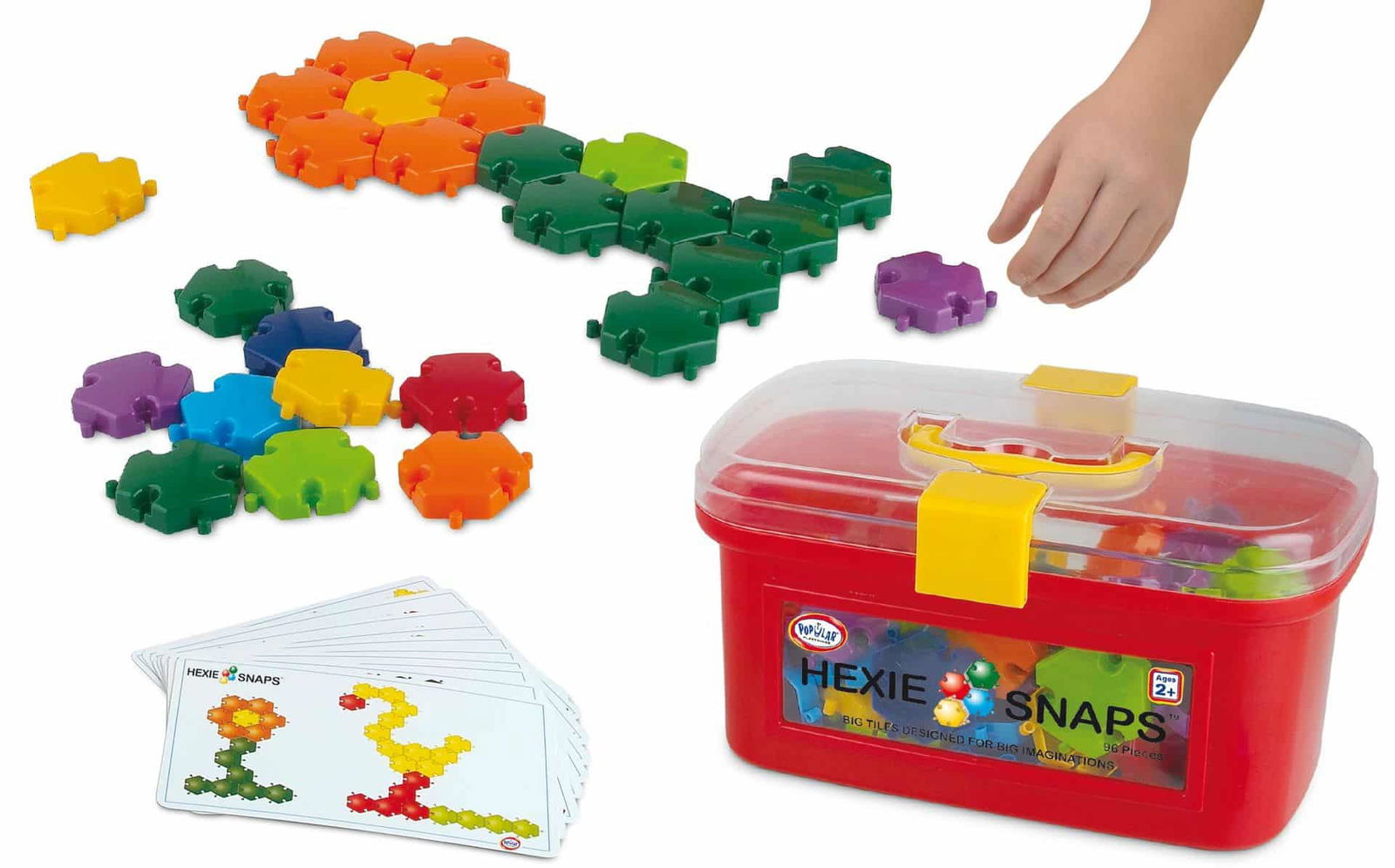 Das Bauspielzeug HEXIE SNAPS von Dragon Toys ist bereits für Kinder unter drei Jahren eine sinnvolle und entwicklungsfördernde Beschäftigungsmöglichkeit. Die robusten Kunststoffteile haben einen Durchmesser von 6,3 cm und können von kleinen Händen gut gegriffen und auf dem Boden oder Tisch zu bunten Mosaiken zusammengesteckt werden. Es ähnelt einem Puzzle, bietet jedoch viel mehr Möglichkeiten, um verschiedene Bilder zu erschaffen.