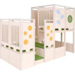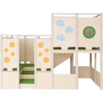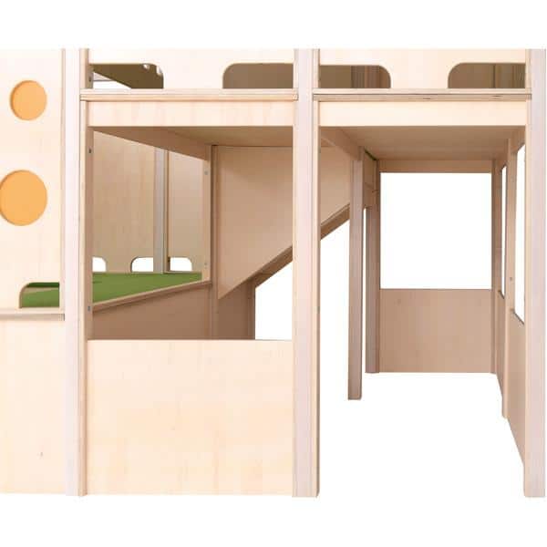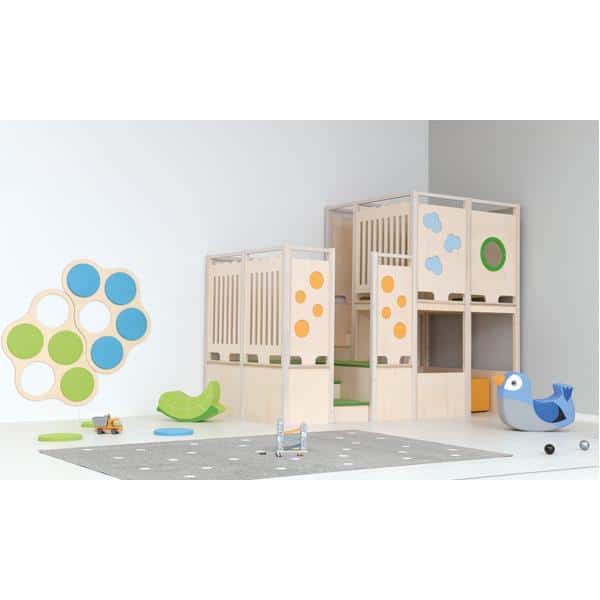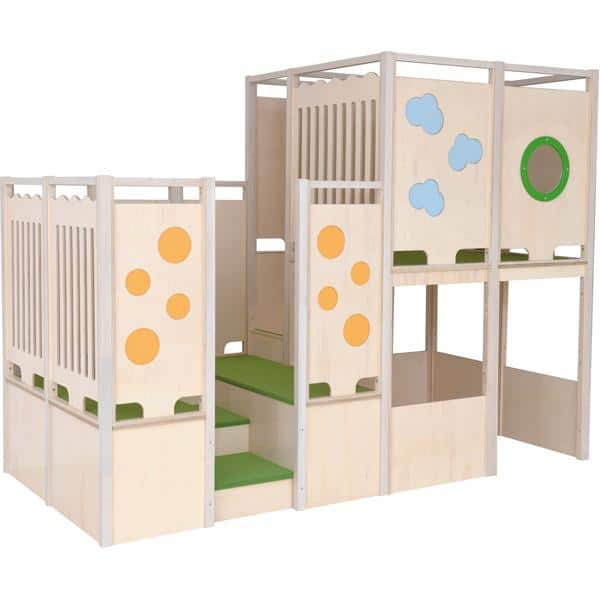 Eine Spielalternative zum Toben, falls draußen das Wetter zu schlecht ist. Das kecke Design und frische Farben beleben den Raum. Der Raum unter dem Podest ist groß genug, um mit Möbeln ausgestattet zu werden. Oben kann man es sich mit Sitzkissen (101119 – 101123 – separat bestellbar) gemütlich machen. In der oberen Ebene gibt es ein Bullauge.