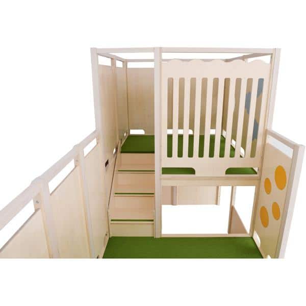 - Bitte ausreichende Raumhöhe beachten, damit die Kinder bequem auf der Ebene stehen und sich zwischen Brüstung und Raumdecke nicht den Kopf einklemmen können. Der Abstand zur Decke muss entweder weniger als 11 cm (bei Krippenkindern 9 cm) oder mehr als 23 cm betragen.