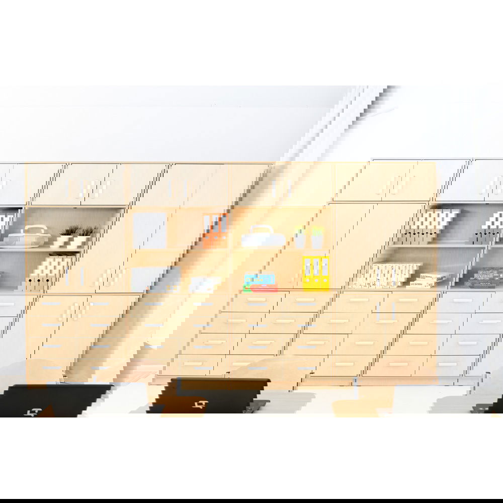 Als Teil der bewährten Flexi-Kollektion besticht dieses Modell durch seine Modularität und Robustheit. Das Set besteht aus einem Basisschrank auf einem stabilen Sockel und einem passgenauen Aufsatzregal, die zusammen eine harmonische Einheit bilden. Die durchgehende Front in natürlicher Birke-Optik sorgt für ein warmes, freundliches Ambiente und lässt den Raum trotz der Größe des Möbels nicht überladen wirken. Hinter den Türen verbergen sich insgesamt fünf Einlegeböden, die flexibel genutzt werden können – ob für schwere Aktenordner, Unterrichtsmaterialien oder Spielzeugkisten. Da dieses Modell ohne Schloss auskommt, ist der Zugriff jederzeit schnell und unkompliziert möglich, was ihn besonders für Materialien geeignet macht, die für alle Nutzer frei zugänglich sein sollen.
