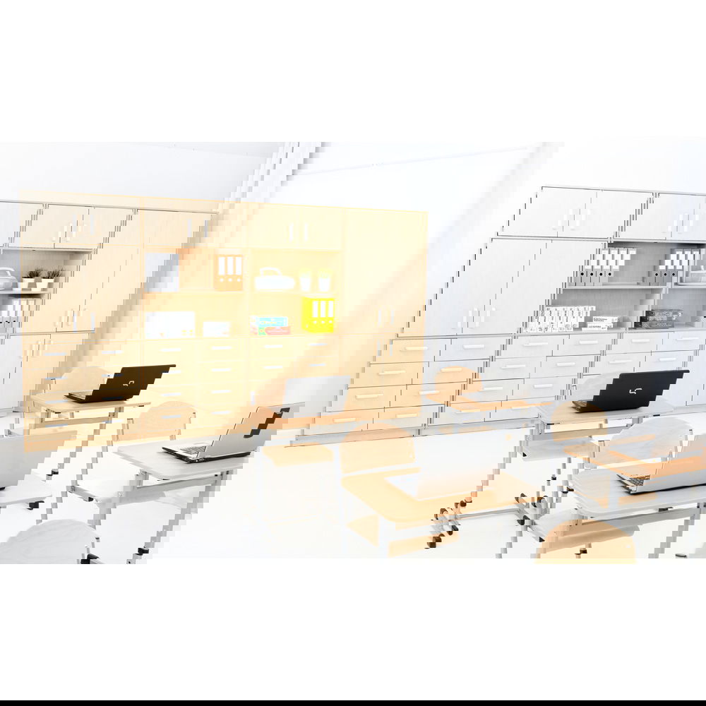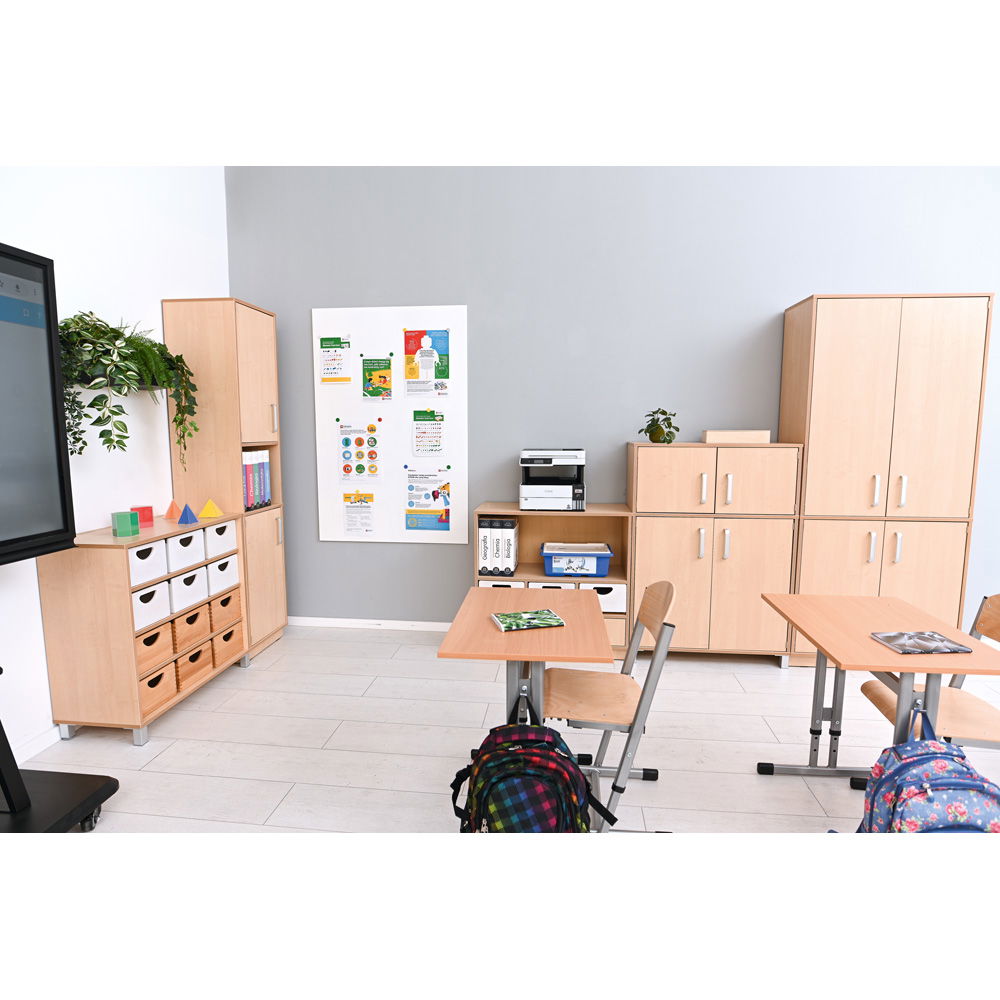 Möbel in Bildungseinrichtungen und Büros müssen viel aushalten. Gefertigt aus 18 mm starker, laminierter Spanplatte mit stoßfesten ABS-Kanten in Multiplex-Optik, ist dieser Schrank extrem widerstandsfähig, kratzfest und pflegeleicht.