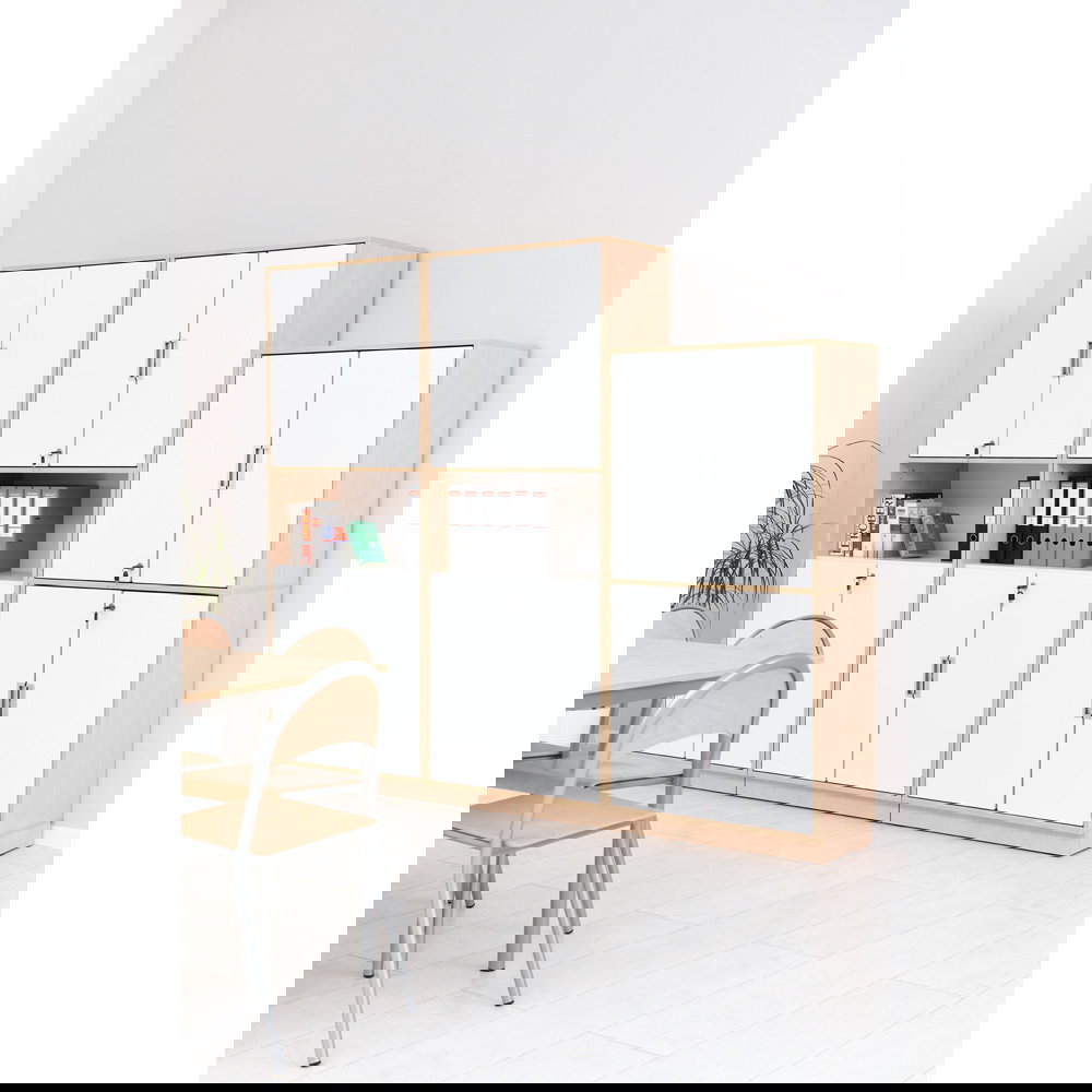 Das durchdachte Konzept dieses Schranks verzichtet bewusst auf eine Mittelwand. Dadurch entsteht im Inneren eine durchgehende, großzügige Fläche, die Ihnen maximale Flexibilität bei der Einteilung bietet. Der Schrank ist speziell auf die Unterbringung von Aktenordnern zugeschnitten und verfügt über insgesamt fünf geräumige Ordnerfächer. Vier dieser Fächer verbergen sich sicher hinter den eleganten, weißen Türen. Da der Schrank abschließbar ist, können Sie hier sensible Dokumente, Personalakten oder wertvolle Arbeitsmittel absolut zugriffssicher aufbewahren. Das fünfte Fach ist bewusst offen gestaltet. Hier finden Dinge ihren Platz, die Sie im Arbeitsalltag ständig zur Hand haben müssen – sei es das aktuelle Klassenbuch, häufig genutzte Nachschlagewerke oder einfach ein paar dekorative Elemente, die den Raum auflockern.