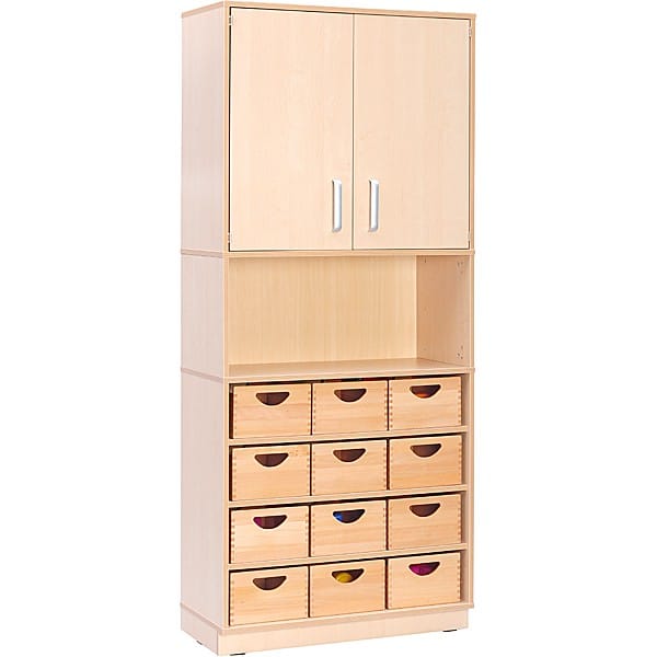 Hochschrank B – Höhe: 203 cm – auf Sockel + 12 Behälter (Flexi 24) für Kindergärten