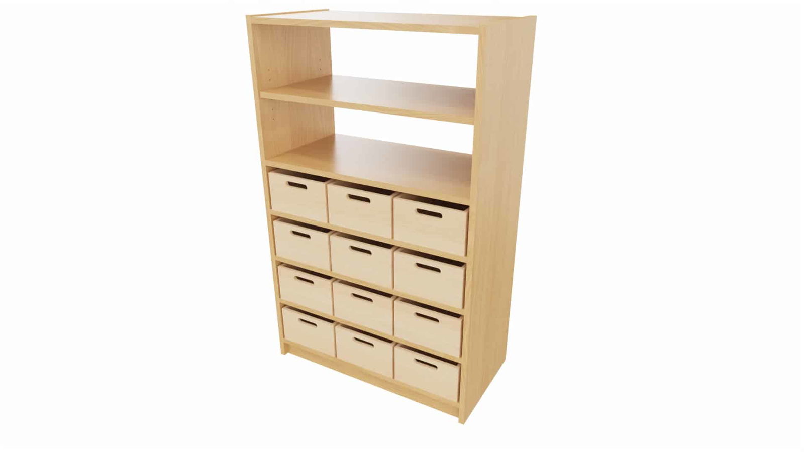 Optimieren Sie Ihre Aufbewahrungslösungen und schaffen Sie ideale Bedingungen für Lernen und Spielen mit dem Hochschrank ST unten: 12 Materialkästen, 3 feste Böden oben: Regal offen (ohne Rückwand), 1 Einlegeboden. Jetzt