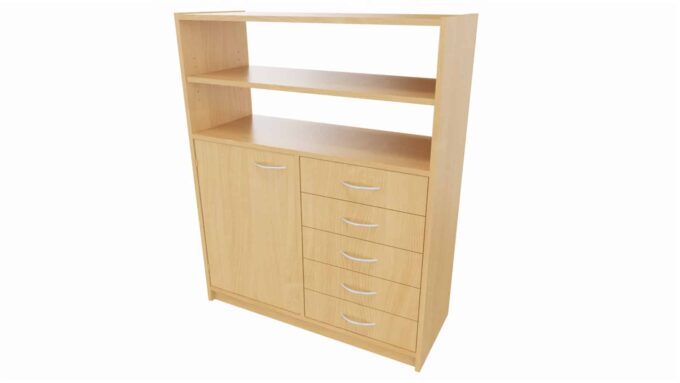 Hochschrank ST: 16 Materialkästen & offenes Regal – 125 cm