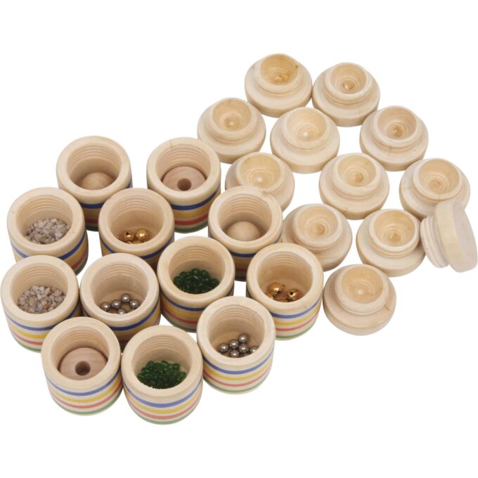 Das Hör-Memo fordert die Merkfähigkeit Ihrer kleinen Entdecker und bietet vielseitige Möglichkeiten, den Hörsinn zu schulen. Jede Holzdose enthält unterschiedliche Inhalte, die durch gezieltes Schütteln der Dosen hörbar gemacht werden. So entstehen verschiedene Klänge, die es zuzuordnen gilt. Mit einem Holzring klingt es anders als mit einer Holzkugel, und feine Glasperlen erzeugen eine ganz andere Melodie als Kieselsteine oder Reis.