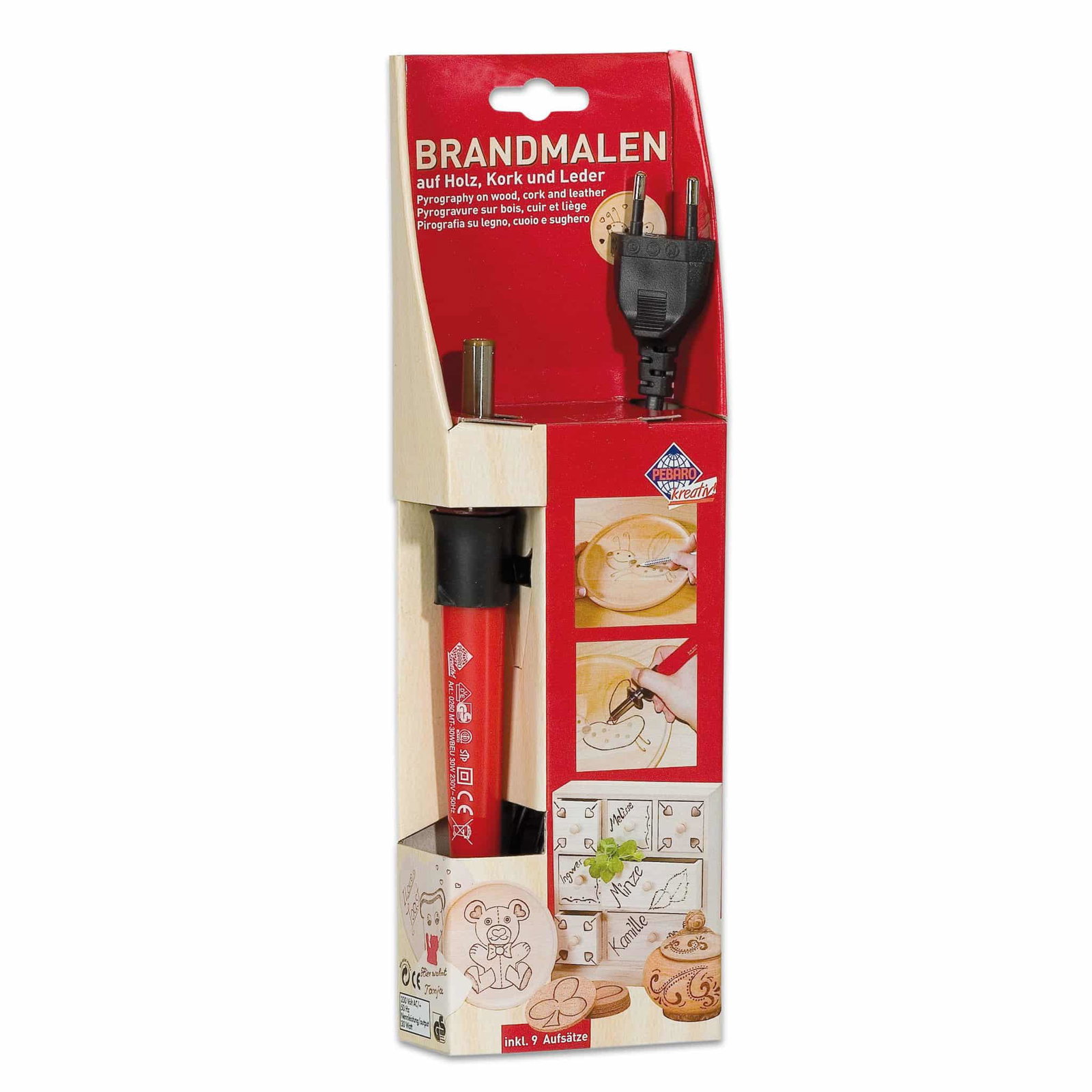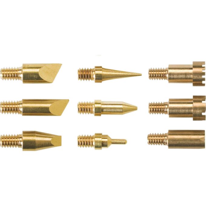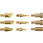 - 9 Brennaufsätze (3 Schreibspitzen, 3 Linienspitzen, 3 Holzbrennstempel)