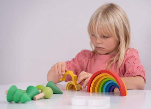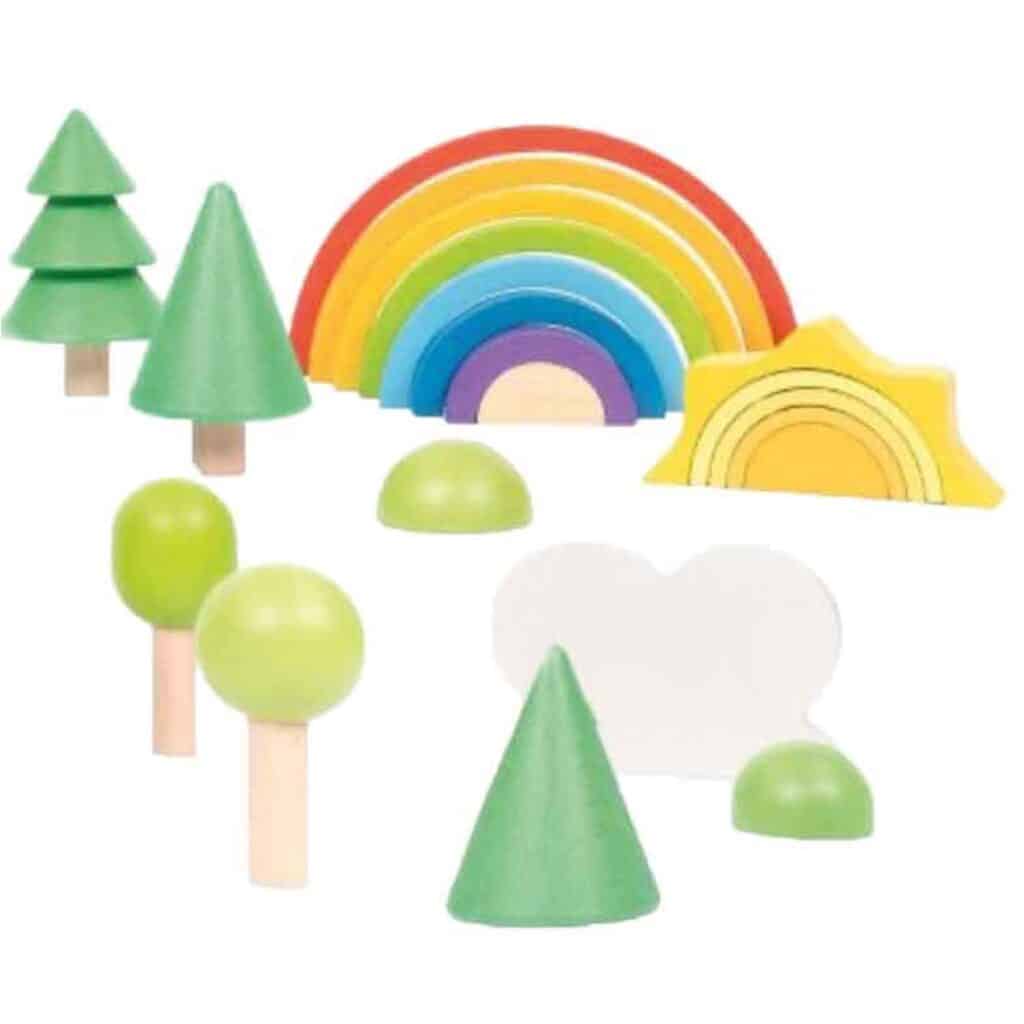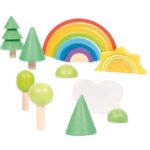 - Passend für jede Spielumgebung: Ob allein oder als Teil einer größeren Spielwelt mit anderen Holzbausteinen – die Regenbogenelemente fügen sich nahtlos in jede Szenerie ein.