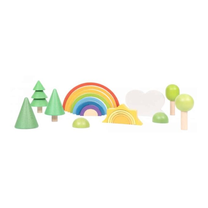 - Passend für jede Spielumgebung: Ob allein oder als Teil einer größeren Spielwelt mit anderen Holzbausteinen – die Regenbogenelemente fügen sich nahtlos in jede Szenerie ein.