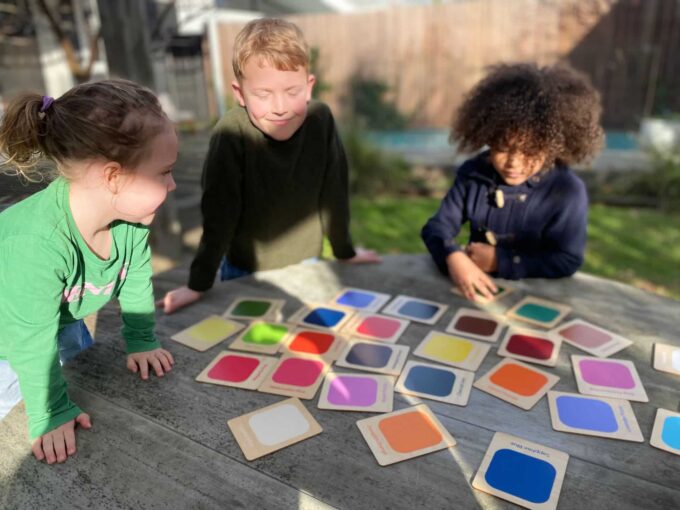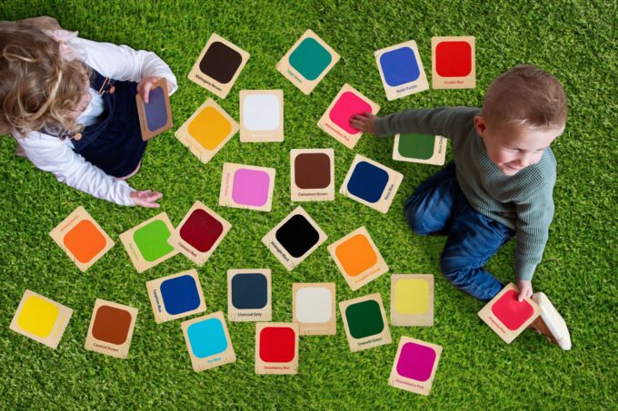 Ideal konzipiert für ein spielerisches Farbenlernen in heimischer Umgebung, lädt das Set dazu ein, konventionelle Farbgrenzen zu überschreiten – wann immer man Farbkreationen wie das Mischen von Eierschalenweiß und Boysenbeerrosa entdecken möchte. Kinder werden dazu angeregt, Objekte in der Natur oder im Haus ausfindig zu machen, die den Farbkarten entsprechen oder zur gleichen Farbfamilie zählen. Diese ansprechenden Karten regen die Kreativität an und bieten unzählige Möglichkeiten für stundenlangen Spielspaß.