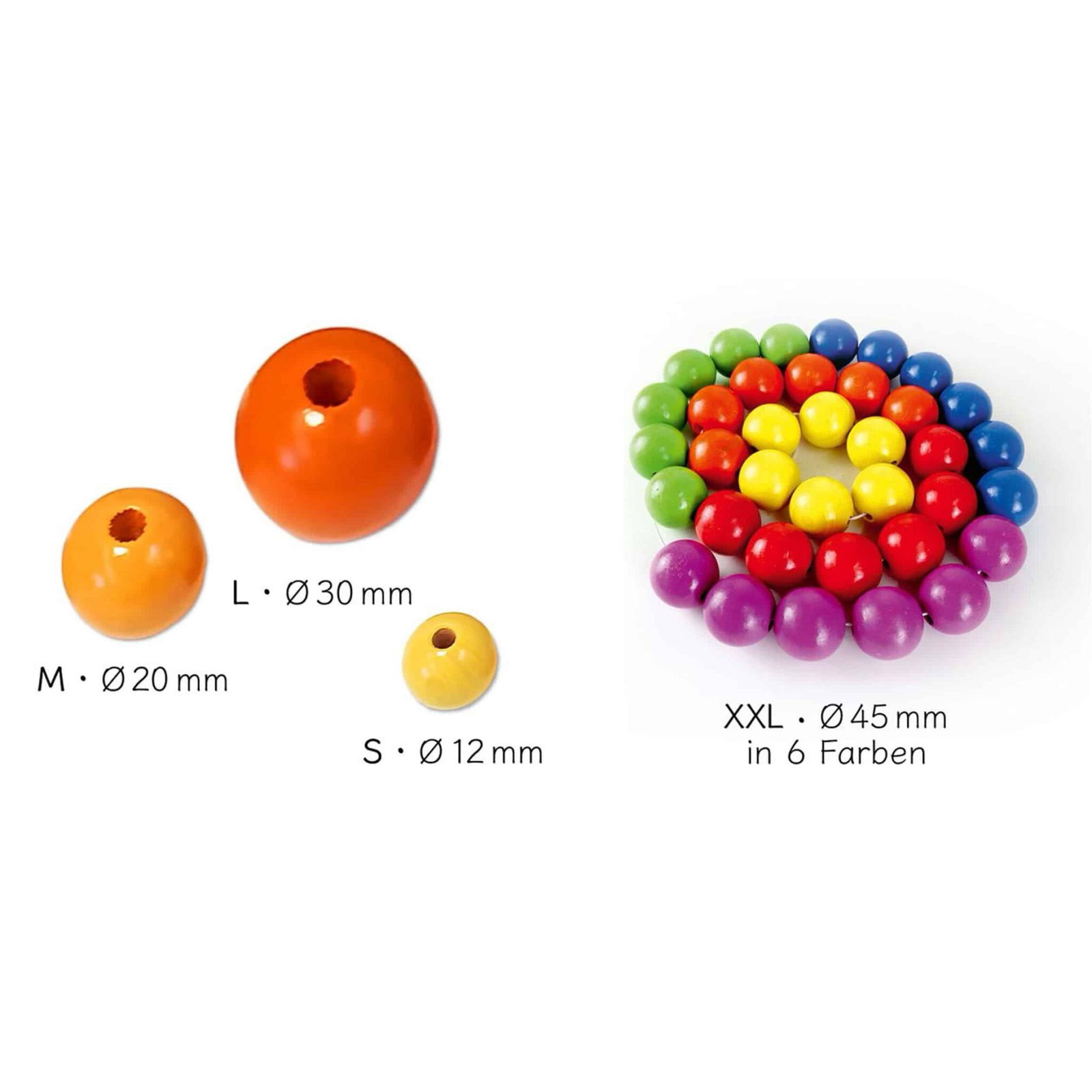 - Art. 1045: XXL-Junior-Perlen, 36 Stück in 6 Farben – Ø 45 mm (nicht abgebildet)