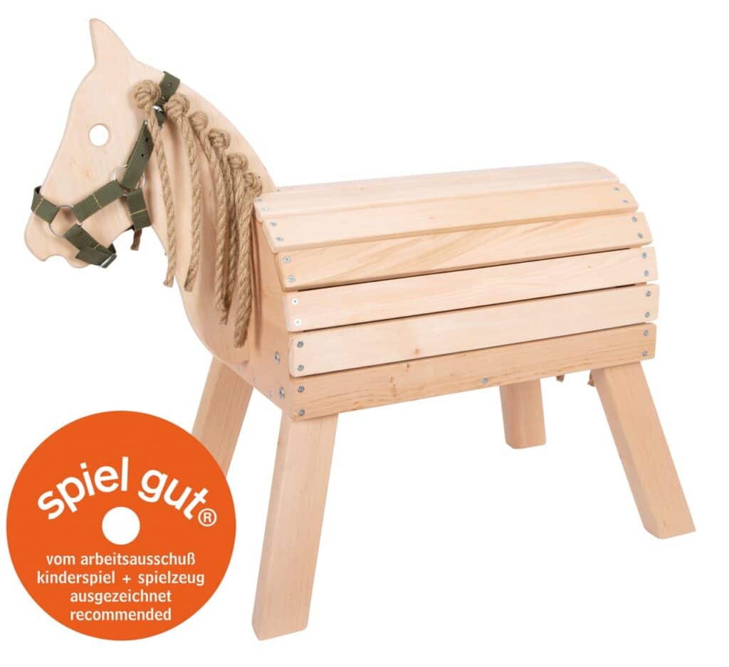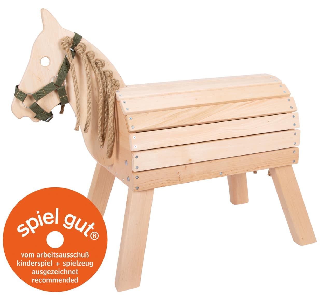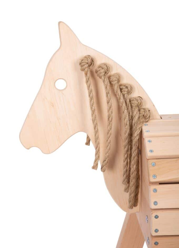 - Sicher und stabil konstruiert: Dank der leicht ausgestellten Beine steht das Holzpferd extrem stabil und kippsicher. Diese robuste Bauweise gewährleistet Sicherheit bei allen Spiel- und Turnabenteuern, ob im Kinderzimmer oder im Garten.