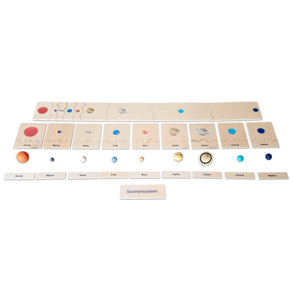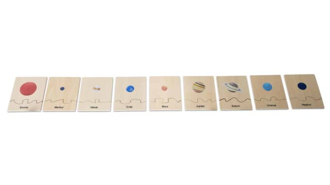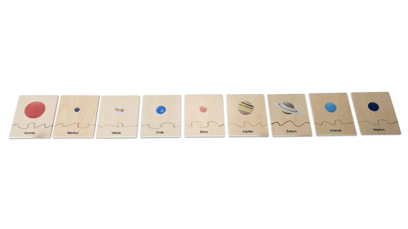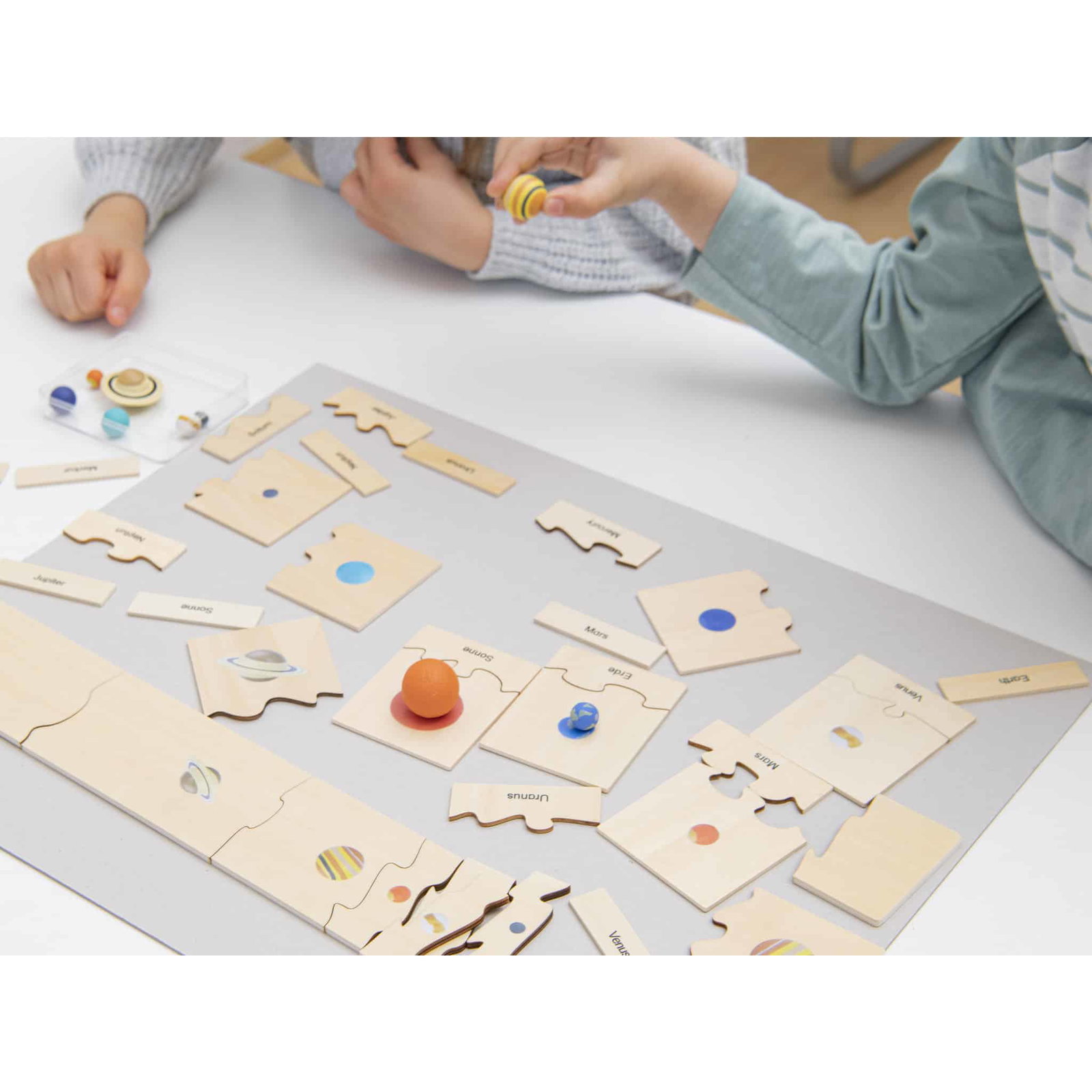 Zusätzlich enthält das Set 2 Holzpuzzles, mit denen die Kinder die Planetenreihenfolge und -namen spielerisch erlernen können. Durch das Zusammenlegen der Puzzlestücke können sie sich selbst kontrollieren und so ihren Lernerfolg direkt überprüfen.