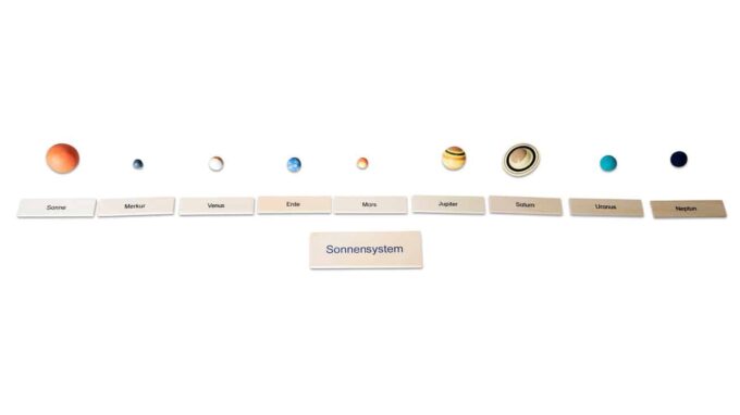 Im Betzold Sonnensystem haben Kinder die Möglichkeit, die 8 Planeten in der Reihenfolge ihrer Umlaufbahnen zu erkunden: Merkur, Venus, Erde, Mars, Jupiter, Saturn, Uranus und Neptun. Die 3D-Kunststoffmodelle sind nicht nur stabil und gut greifbar, sondern auch abwaschbar, was sie ideal für den langfristigen Gebrauch macht. Die dazugehörigen Namensschildchen aus Holz helfen den Kindern, die Planeten zu benennen und ihre Position im Sonnensystem zu verstehen.