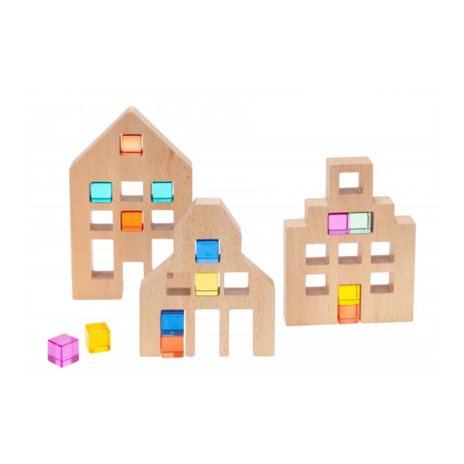 Das Set besteht aus drei unterschiedlich hohen Häusern, die eine spannende Vielfalt in der Anordnung ermöglichen. Ob als Bauprojekt für Kinder, Dekoration für besondere Anlässe oder entspannende Fensterdeko, die Holz Häuser inspirieren große und kleine kreative Köpfe. Mit den passenden Acrylwürfeln erzeugen die Häuser faszinierende Farbspiele, die durch Lichtquellen wie Sonnenlicht oder Lampen verstärkt werden können. Dadurch werden nicht nur die Sinne angesprochen, sondern auch die Fantasie angeregt – perfekt für Kinder ab 2 Jahren und Erwachsene, die Freude an schönem Design haben.