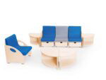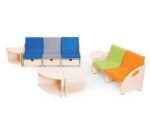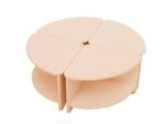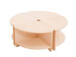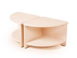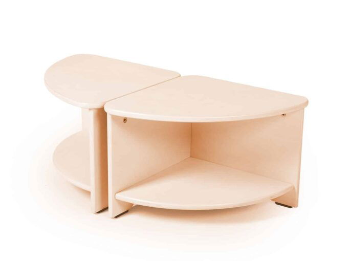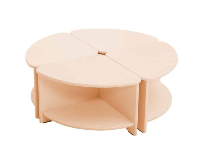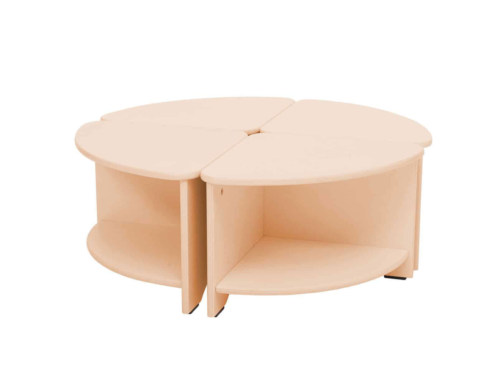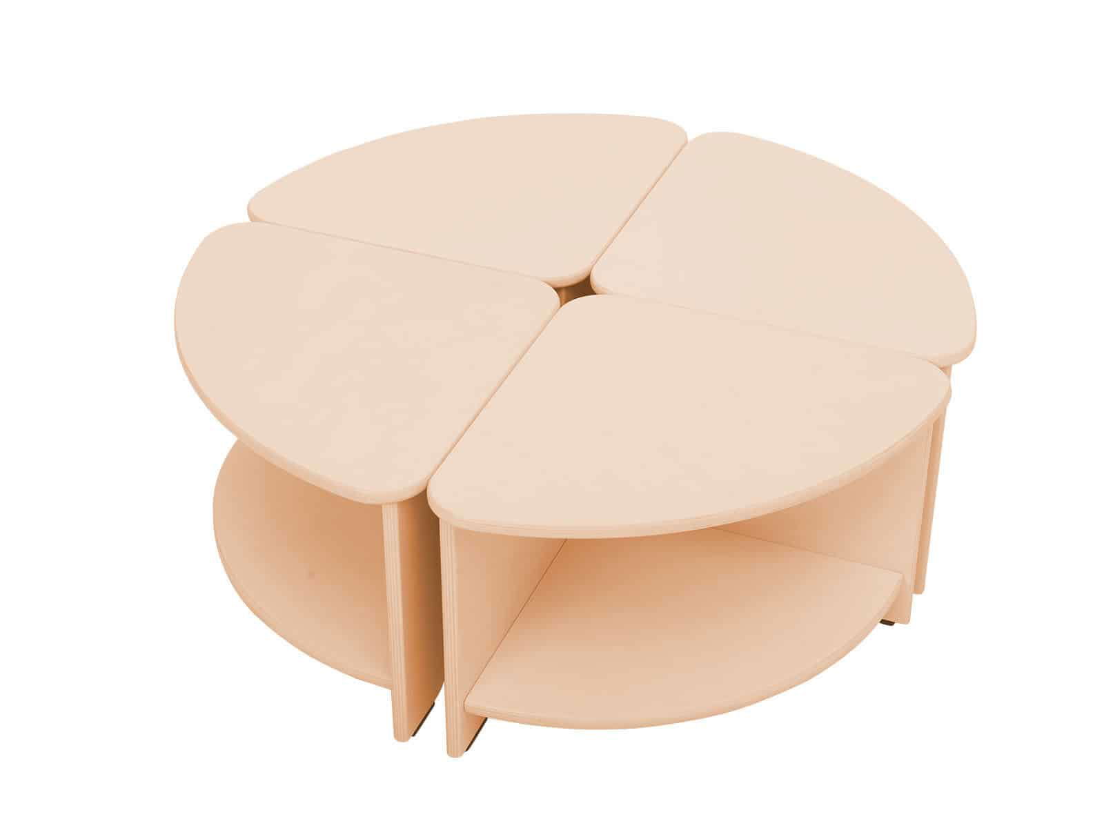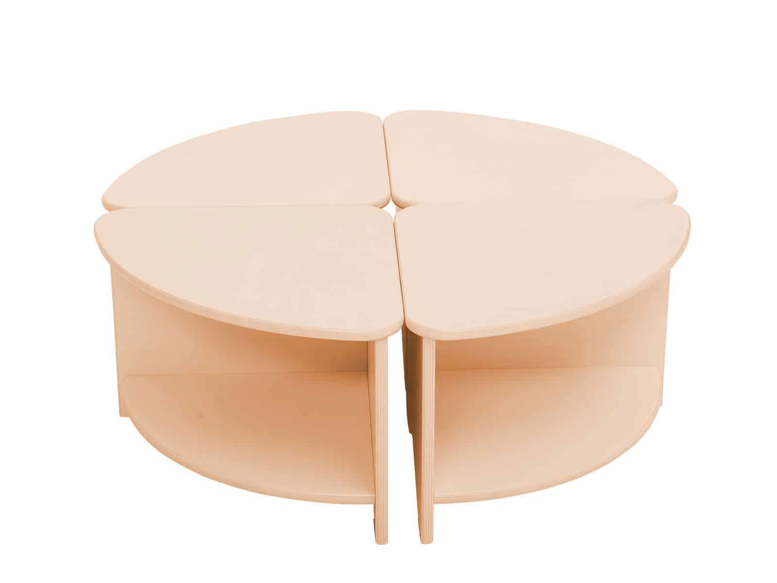 Komplett aus Sperrholz gefertigt, mit transparenter Farbe lackiert. 4 einzelne Tischteile können einen großen, runden Tisch bilden.