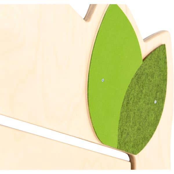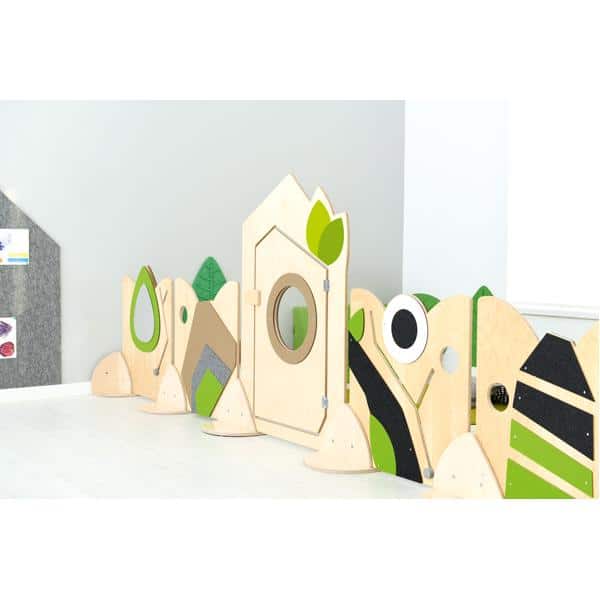 Mit diesen Holztrennwänden können schnell verschiedene Bereiche abgetrennt werden: Spiel- oder Erholungsbereich, Krabbelecke. Spiel- und Sensorikelemente beschäftigen die Kleinen zusätzlich. Die stabilen Ständer sorgen für einen sicheren Stand. Zusätzlich können die Außenelemente auch an der Wand befestigt werden. Dank dem Einsatz von Filzelementen verhelfen sie auch zu mehr Ruhe, weil sie störende Geräusche dämpfen. Die Module passen farblich und thematisch zu unseren Spielecken Alpenblick (096950) und Flora (099386). Alle Schmuck- und Spielelemente beidseitig. Ständer (099398, 099399) und Wandbefestigungselemente (099397) separat zu bestellen.
