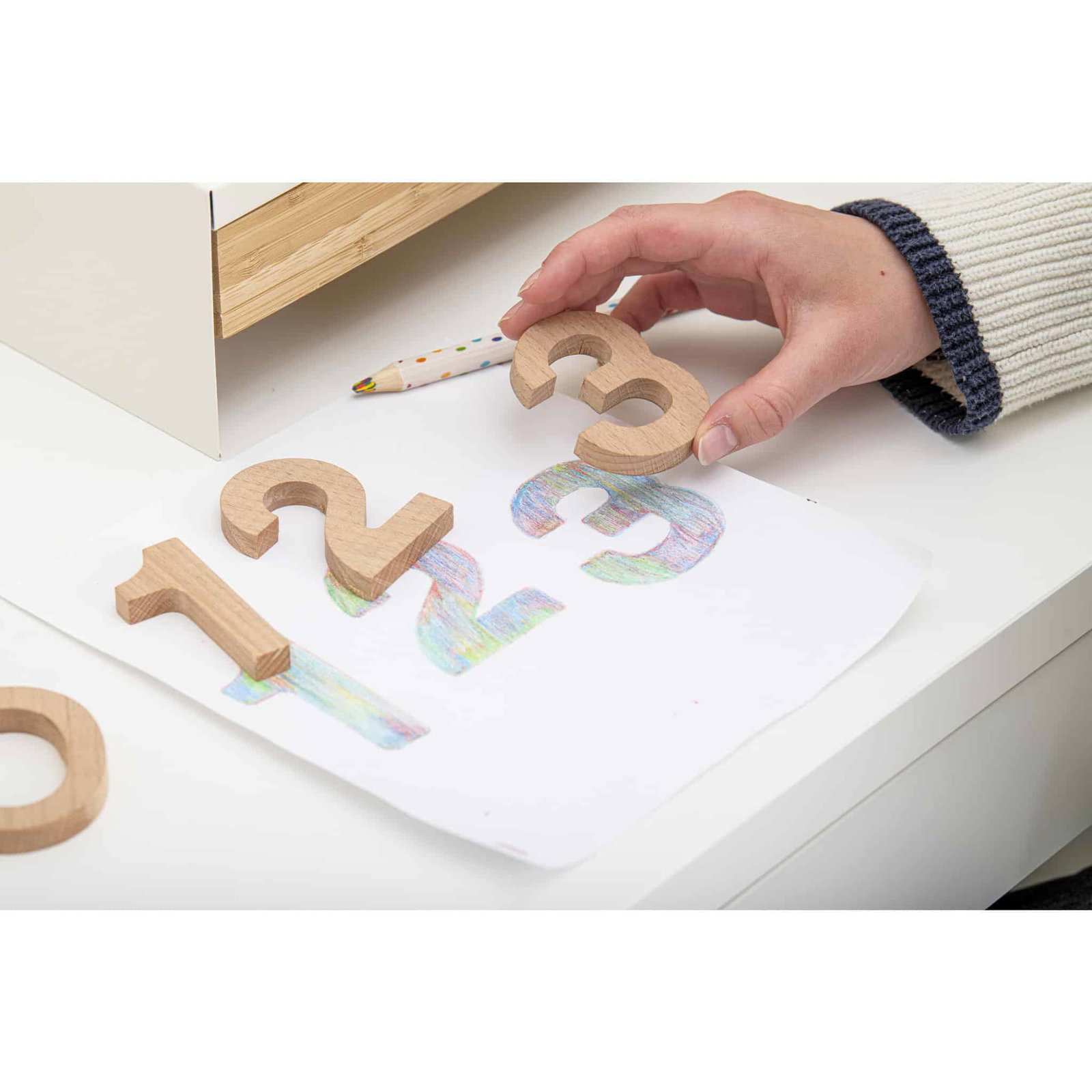 Zusätzlich ermöglicht die Verwendung von Holzziffern auch das erste Zählen oder Verstehen von Zahlensystemen. Wenn die Kinder die Ziffern in verschiedenen Übungen verwenden, stärken sie ihr Verständnis für Zahlen und lernen auf anschauliche Weise, wie man mit ihnen rechnet.