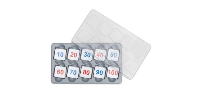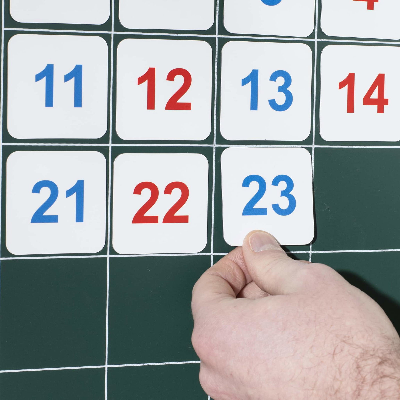- 100 doppelseitig magnetische Zahlenplättchen (rot/blau)