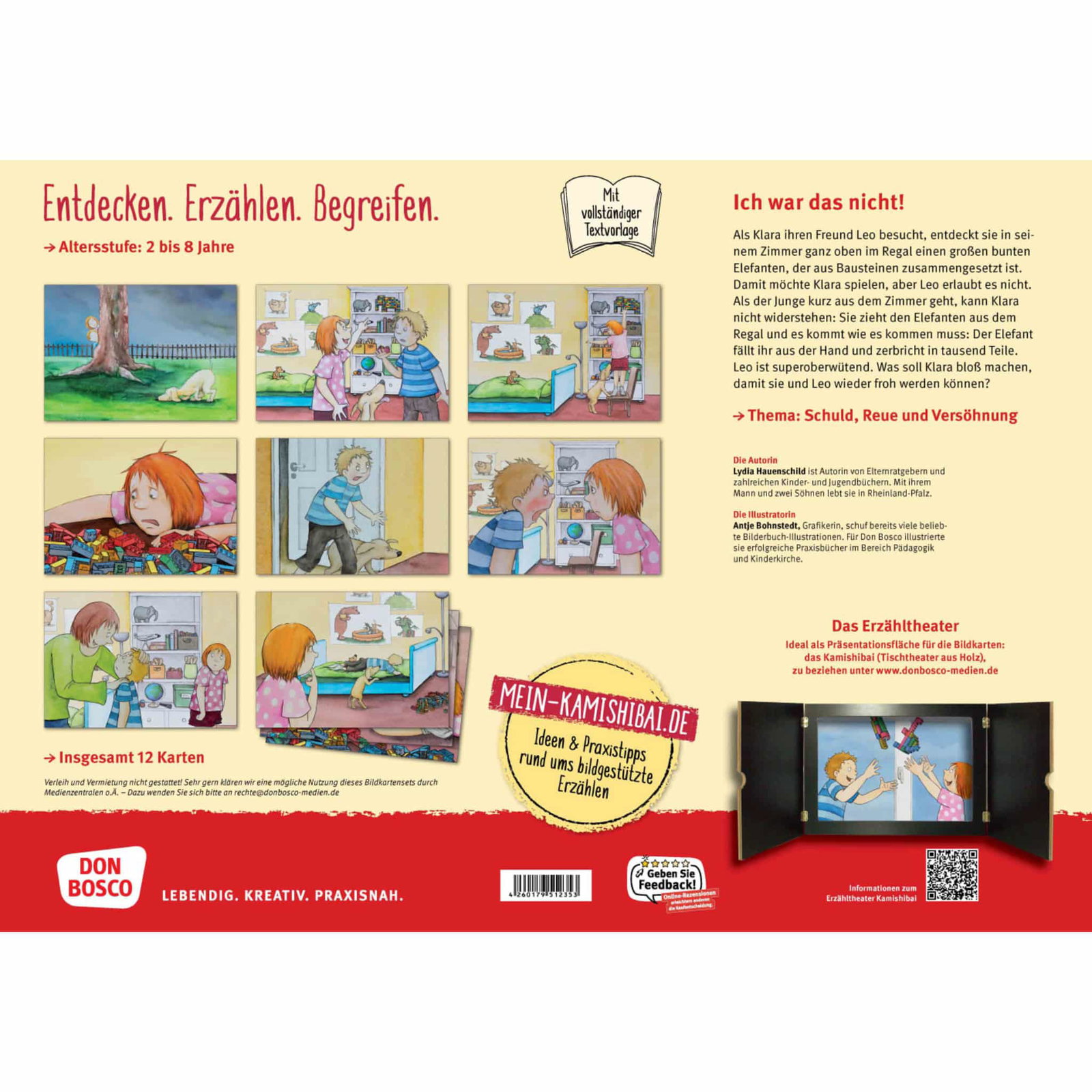 In „Ich war das nicht!“ erleben die Kinder das Abenteuer eines Elefanten, der aus bunten Bauteilen gebaut wird und unweigerlich bricht. Die Geschichte beschreibt, wie aus einem Missgeschick Unmut und Traurigkeit entstehen können und wie wichtig es ist, solche Gefühle zu erkennen und darüber zu sprechen. Mithilfe der Bilderbuchkarten können Kinder die Emotionen, die aus Konflikten entstehen, nachempfinden und gemeinsame Lösungsansätze entwickeln.