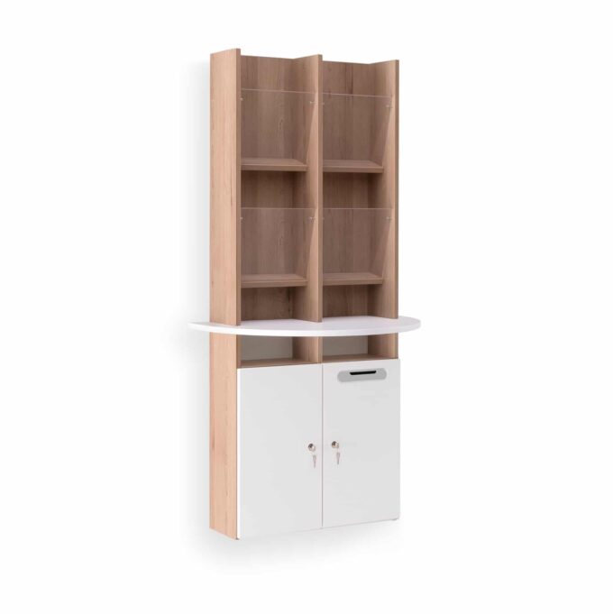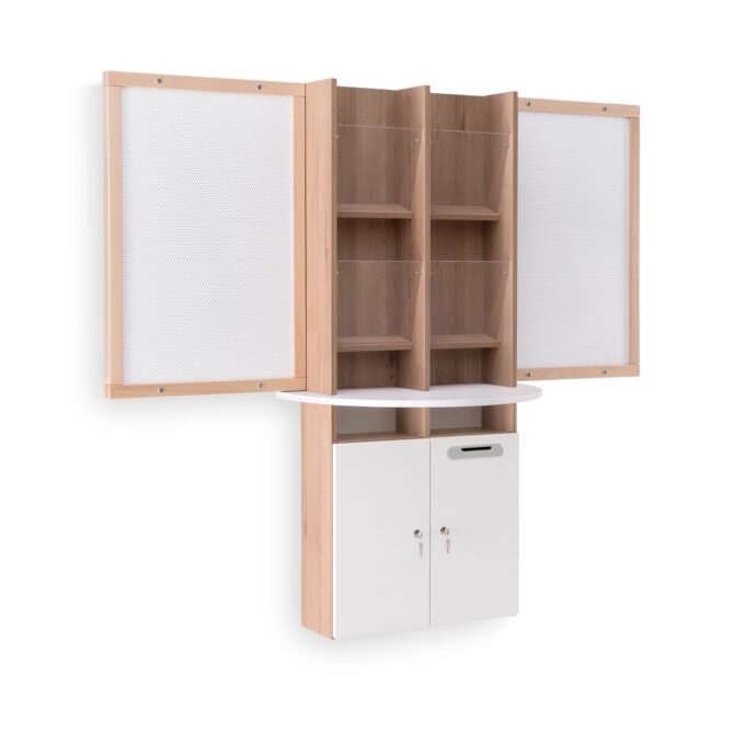 - Zwei offene Ablagefächer: Praktische Aufbewahrung für Stifte, Formulare oder zusätzliches Informationsmaterial – jederzeit griffbereit.