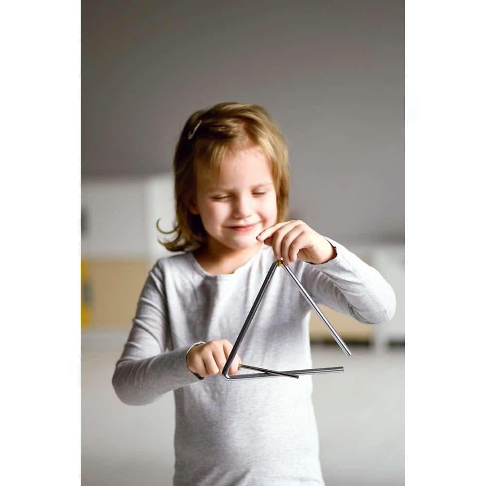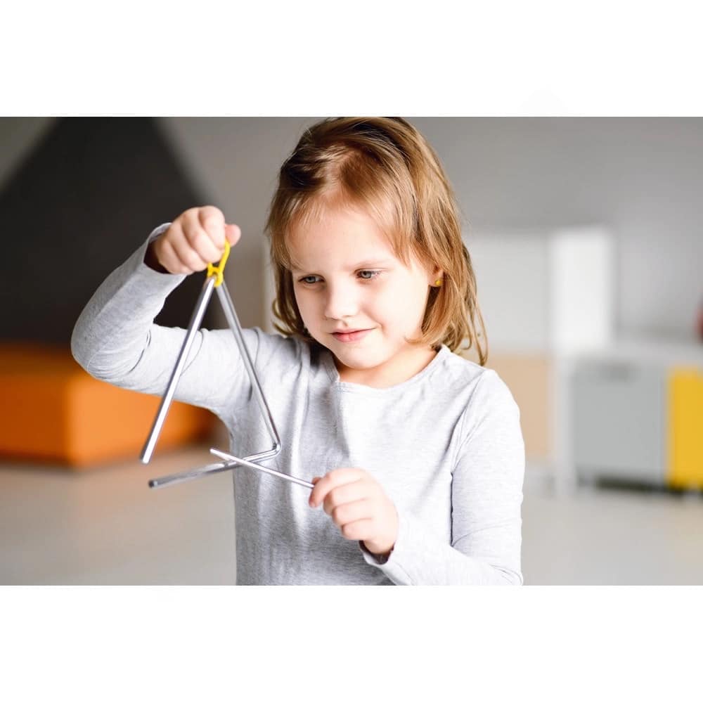 - 5 Triangeln mit Schlägel (Maße: 20,5 cm, 17,5 cm, 15,5 cm, 13 cm und 10,5 cm): Die Triangeln bieten eine Vielzahl von Klangmöglichkeiten und sind perfekt für das Erlernen von Melodien.