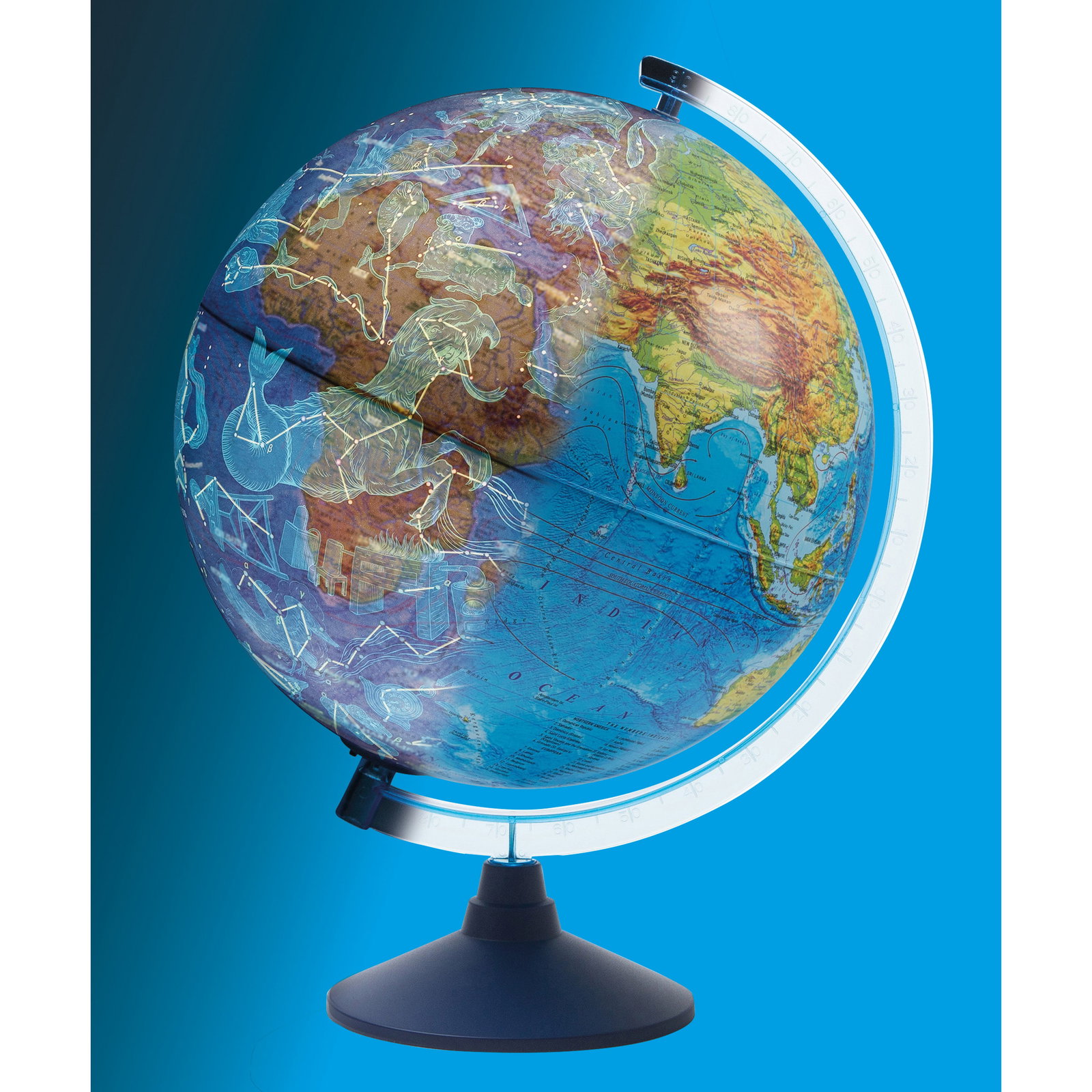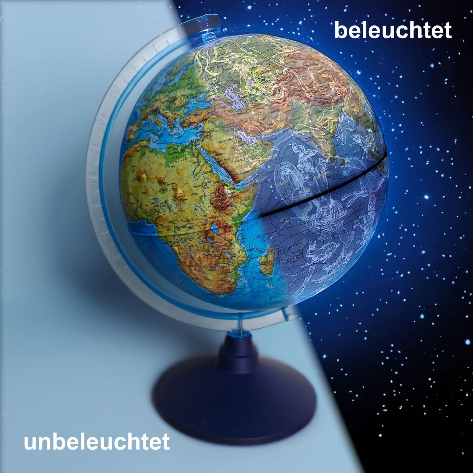 - Zwei Welten in einem Modell: Der Wechsel zwischen der physischen Weltkarte im unbeleuchteten Zustand und der Sternbildkarte im beleuchteten Zustand vermittelt spielerisch Grundlagen der Geografie und Astronomie.