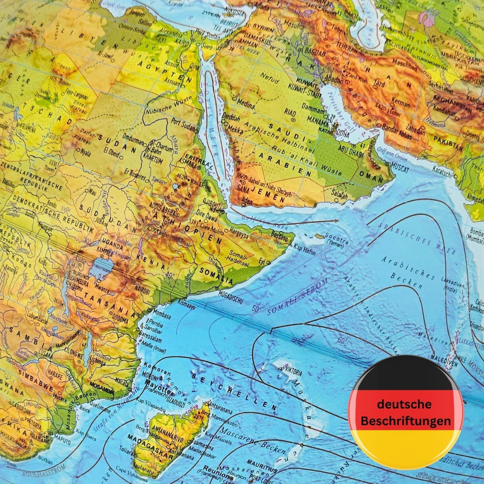 Wenn die jungen Entdecker mit ihren Händen über die Kugel streichen, spüren sie dank der ausgeprägten 3D-Reliefoberfläche die Erhebungen mächtiger Gebirgszüge. Dieses taktile Erlebnis hilft dabei, sich geografische Strukturen viel besser einzuprägen, da das Wissen buchstäblich begreifbar wird. Im unbeleuchteten Zustand zeigt der Globus ein detailliertes physisches Kartenbild der Land- und Wassermassen unserer Erde. Alle Länder, Kontinente und Ozeane sind mit einer klaren, deutschen Beschriftung versehen, was den Einstieg in das Thema für die Kinder besonders leicht und verständlich macht. Sie lernen, wo große Wüsten liegen, wie weit Ozeane reichen und wo sich ihr eigenes Heimatland befindet.