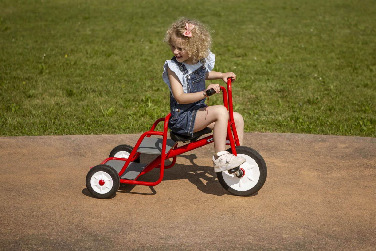 Das Dreirad Redline Quickly ist perfekt für schnelle und kurze Wege ausgelegt – ein Zweisitzer-Dreirad mit bequemer Sitzmöglichkeit und einem Zugang von hinten, sodass Spielgefährten blitzschnell nach einem kurzen „Stop!“-Ruf an den Fahrer auf- und absteigen können. Das vordere Kind übernimmt die Rolle des Fahrers und Pedalierers, welches sowohl die Kontrolle als auch das Vergnügen der kleinen Reisegemeinschaft sichert. Quickly ist ebenfalls hervorragend für Rollenspiele oder vielseitige Aktivitäten geeignet, auch mit jüngeren Kindern.