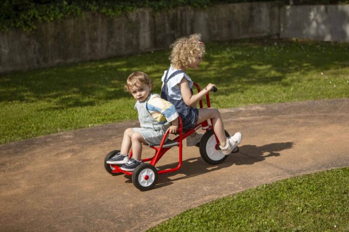 Das Dreirad Redline Quickly ist perfekt für schnelle und kurze Wege ausgelegt – ein Zweisitzer-Dreirad mit bequemer Sitzmöglichkeit und einem Zugang von hinten, sodass Spielgefährten blitzschnell nach einem kurzen „Stop!“-Ruf an den Fahrer auf- und absteigen können. Das vordere Kind übernimmt die Rolle des Fahrers und Pedalierers, welches sowohl die Kontrolle als auch das Vergnügen der kleinen Reisegemeinschaft sichert. Quickly ist ebenfalls hervorragend für Rollenspiele oder vielseitige Aktivitäten geeignet, auch mit jüngeren Kindern.