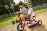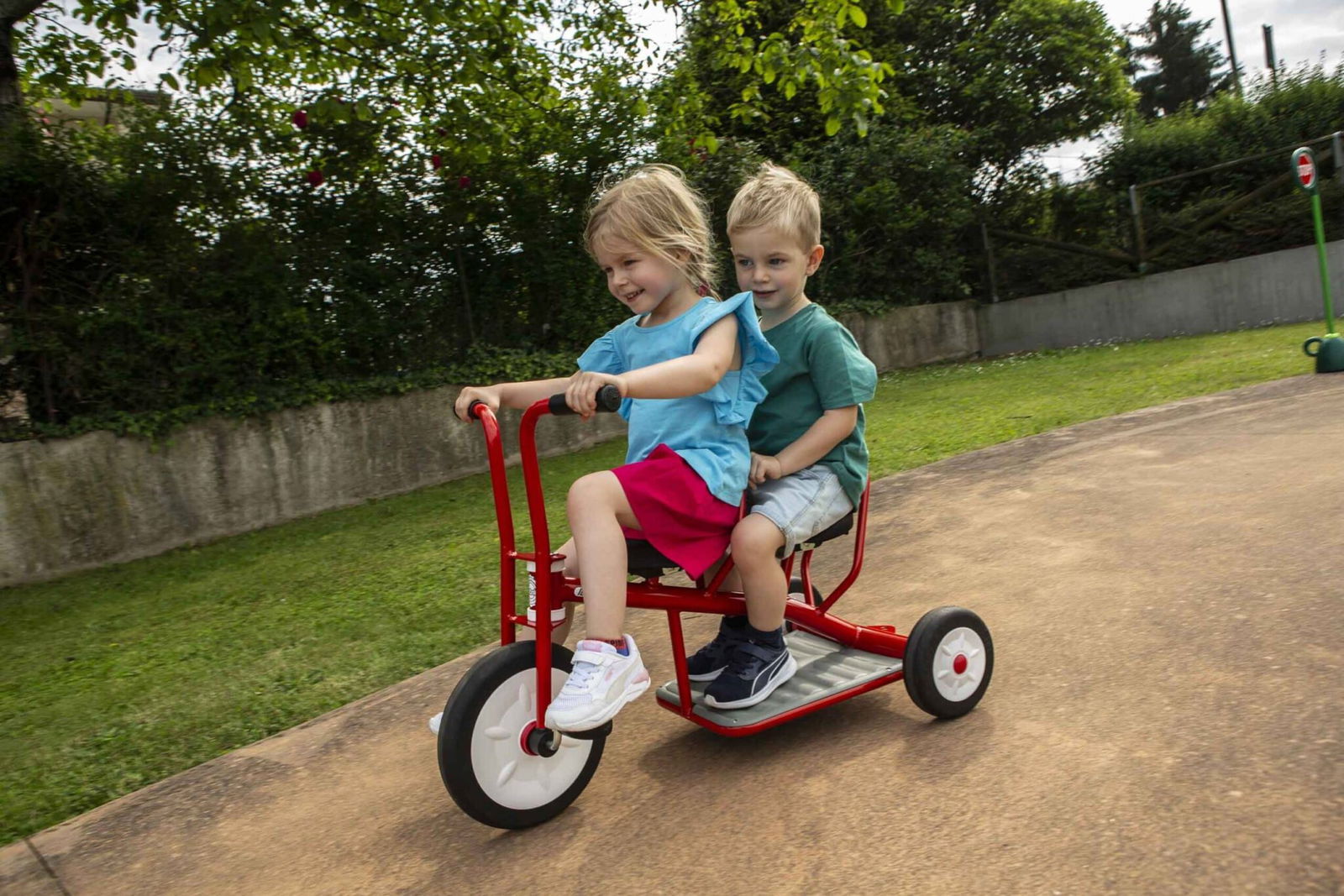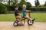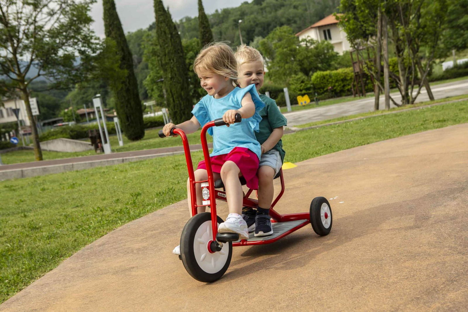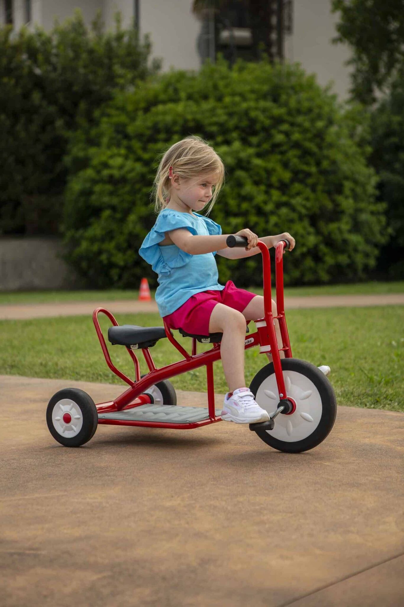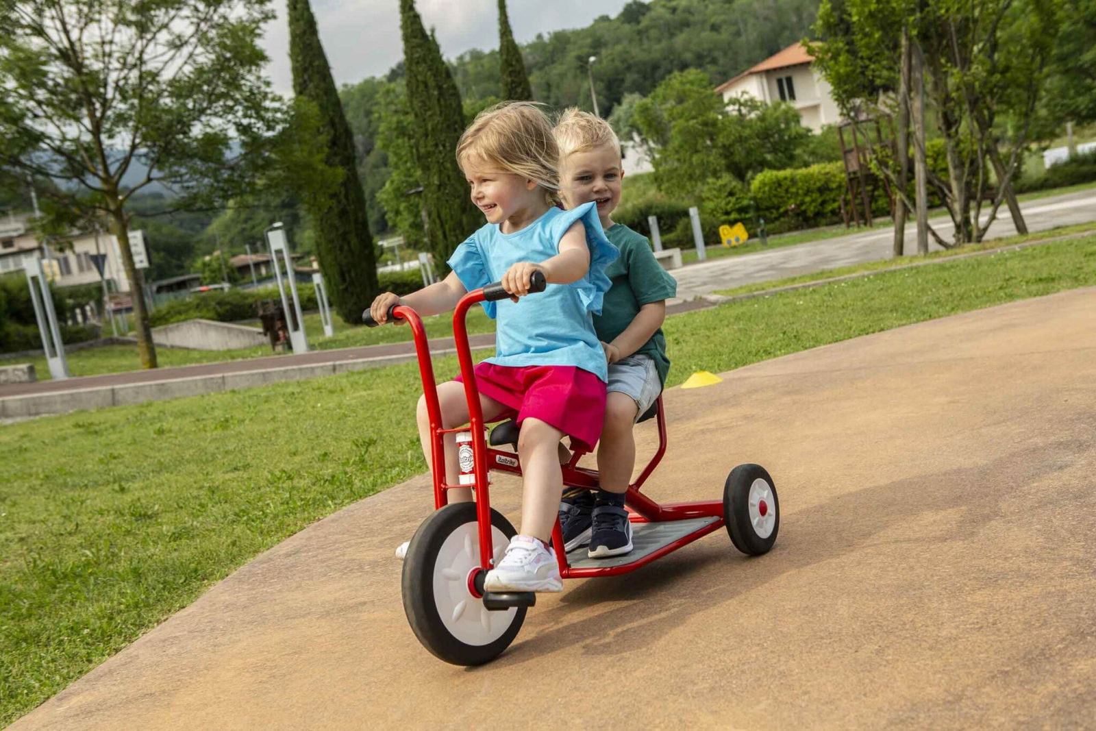 Mit dem Carry lernen die Kinder gemeinsam, das Dreirad in Kurven zu manövrieren – der Beitrag des Beifahrers ist dabei essentiell, um die richtigen Bewegungen auszuführen. Sie üben das Pedalieren in großen Räumen und lernen, zwischen möglichen Hindernissen zu navigieren. Dabei gewöhnen sie sich an das Treten bei einem Produkt mit höherem Gewicht. Dieses Dreirad ermöglicht eine Vielzahl neuer Aktivitäten, die Fähigkeiten entwickeln, Kreativität anregen und das Teilen fördern.
