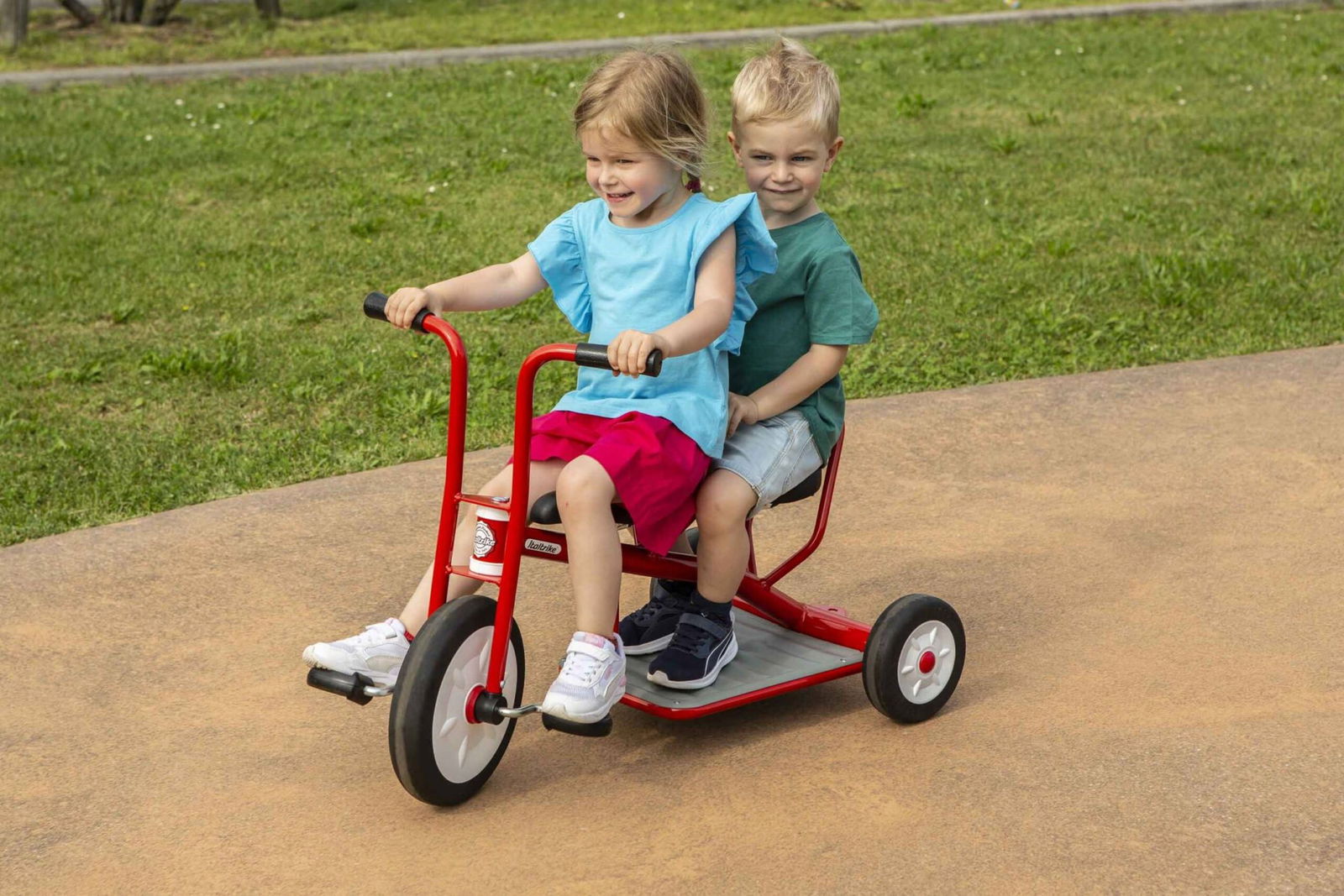 Der Tricycle Carry ist gezielt darauf ausgelegt, das Teamspiel und das Teilen von lustigen Erlebnissen zu fördern; er ist hervorragend geeignet, um Paarspiele und Rollenspiele zwischen älteren und jüngeren Kindern oder zwischen Kindern, die einen Partner benötigen, um neue Aktivitäten auszuführen, zu realisieren. Mit einem robusten, in der Mitte verlängerten Stahlrahmen, bietet dieses Dreirad eine solide Basis für abenteuerliches Spielen.