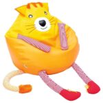 Sensorische Elemente: Pfoten mit Knöpfen und Schlaufen, quietschende Nase, raschelnde Ohren, Fellimitat auf dem Kopf, Gürtel mit Glöckchen, Beine mit Schnürsenkeln und Erbsenfüllung.