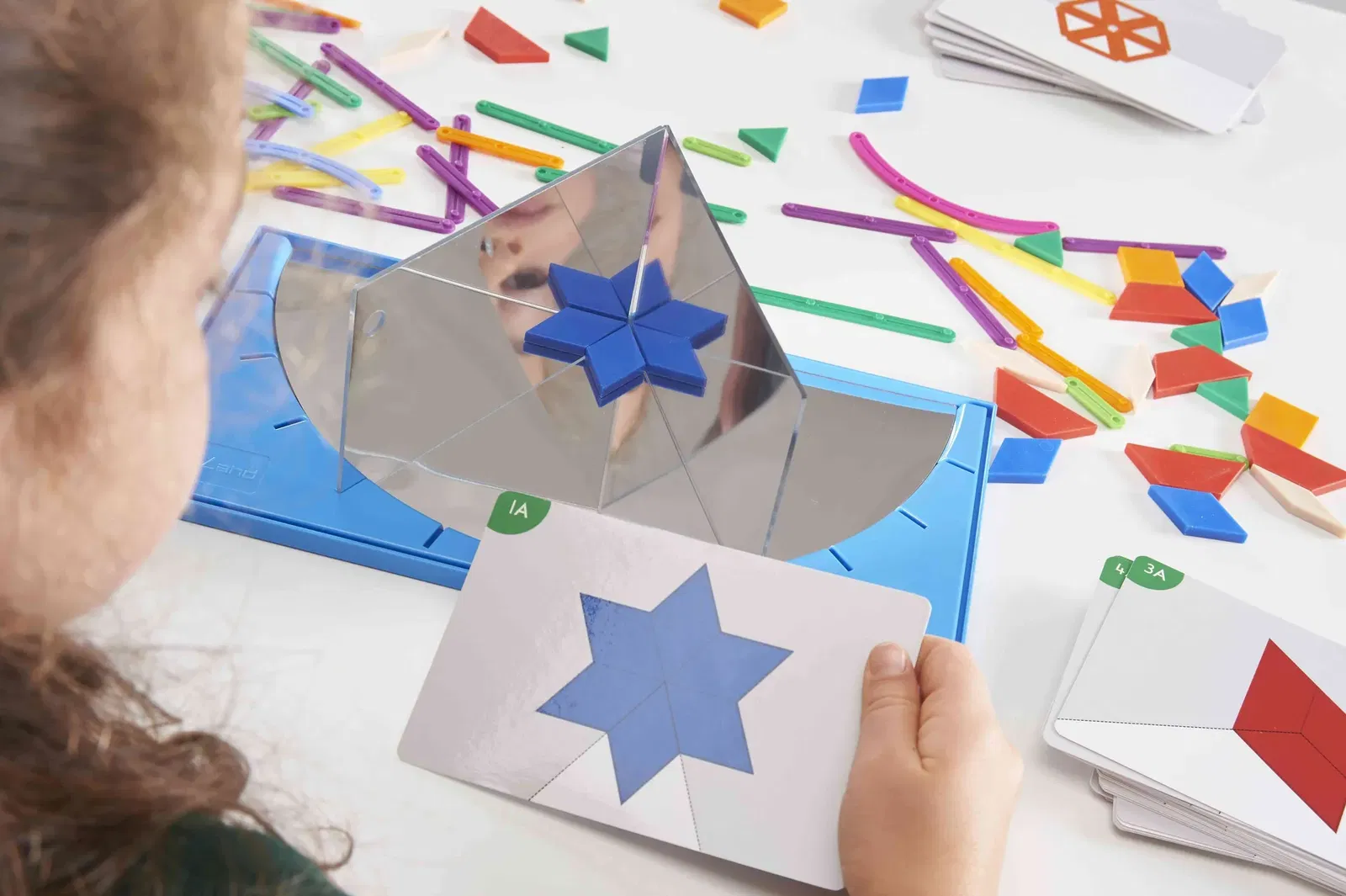 Das Herzstück des Sets bilden vier hochwertige Acrylspiegel, die in einem cleveren Kunststoffrahmen mit einer präzisen 15-Grad-Winkeleinteilung integriert sind. Kinder platzieren die bunten Musterblöcke oder GeoStix vor den Spiegeln und beobachten staunend, wie sich ihre Kreationen vervielfachen und in wunderschöne, symmetrische Kunstwerke verwandeln. Durch das Experimentieren mit verschiedenen Winkeln entdecken sie ganz intuitiv die mathematische Formel hinter den Reflexionen. So wird aus abstraktem Wissen ein greifbares, visuelles Erlebnis, das die Kreativität entfesselt und die Freude am Lernen nachhaltig fördert.