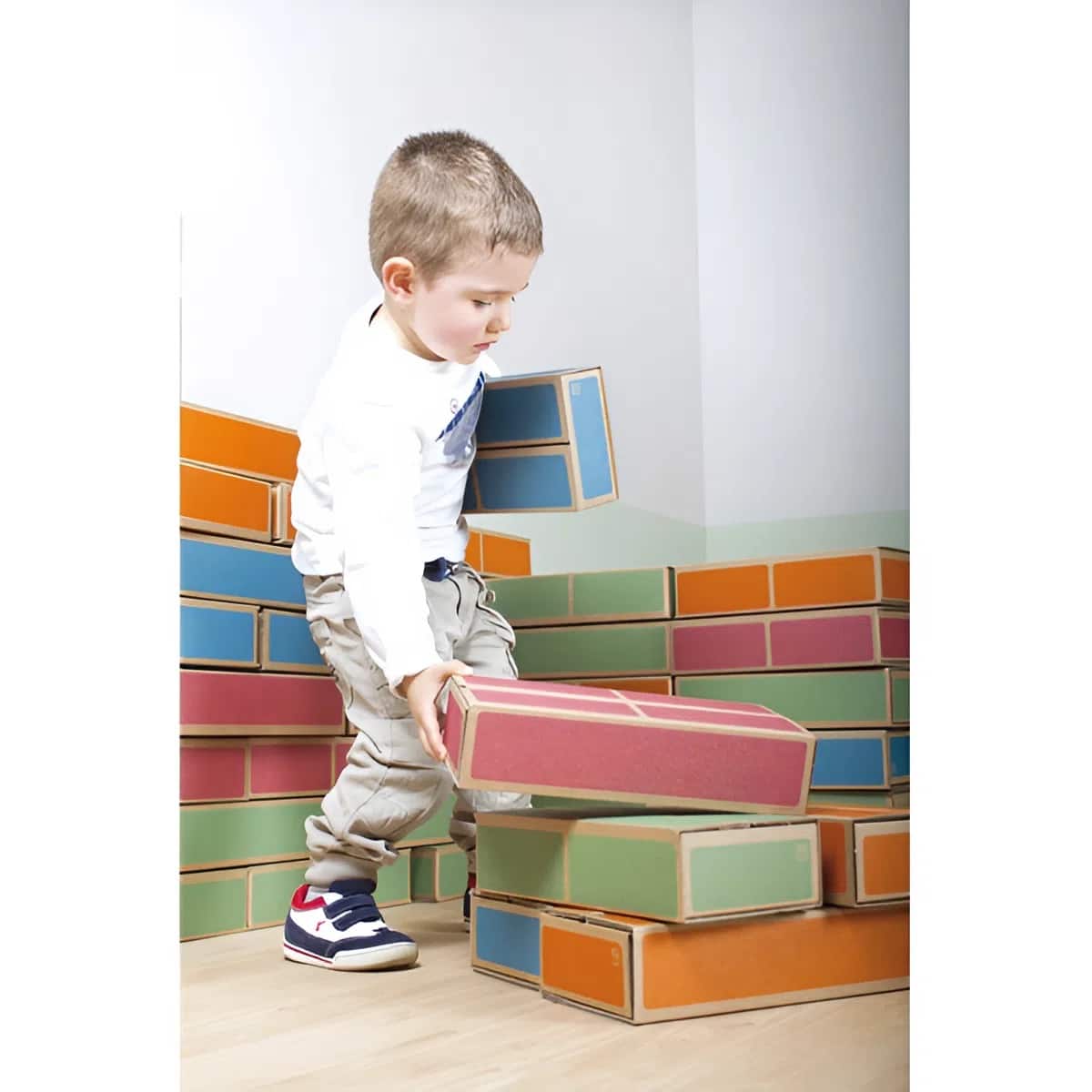 Diese Kartonbausteine sind die ideale Alternative zu schweren Holz- oder lautstarken Plastiksteinen. Sie verbinden haptisches Erleben mit sicherer Spielumgebung.