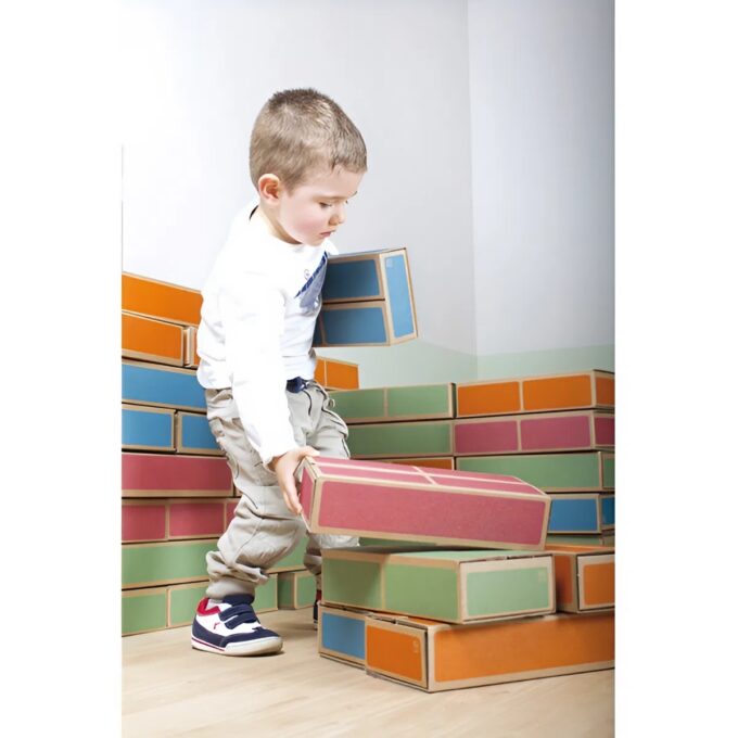 Das Geheimnis liegt in der cleveren Konstruktion. Gefertigt aus extra stabilem, bedrucktem Karton, sind diese Steine so robust, dass sich Kinder sogar darauf setzen können. Gleichzeitig sind sie so leicht, dass selbst Kleinkinder sie mühelos heben, stapeln und transportieren können. Die pastellfarbene Gestaltung in Blau, Rot, Grün und Orange bringt freundliche Farbe ins Spiel, ohne aufdringlich zu wirken. Geliefert werden die Steine flachliegend – das gemeinsame Auffalten vor dem ersten Einsatz ist bereits der erste Teil des Bauabenteuers und steigert die Vorfreude auf das große Stapeln.