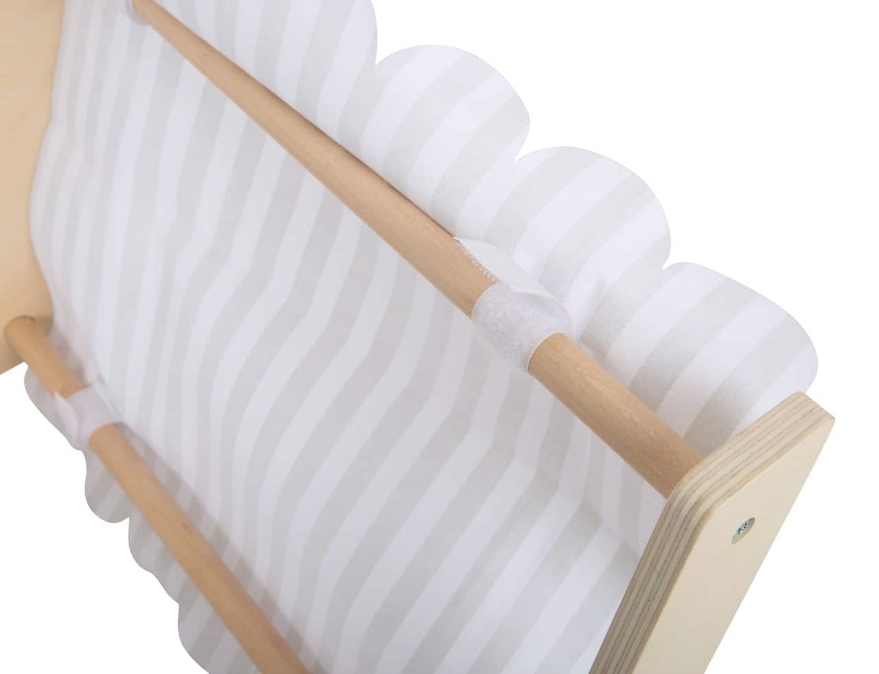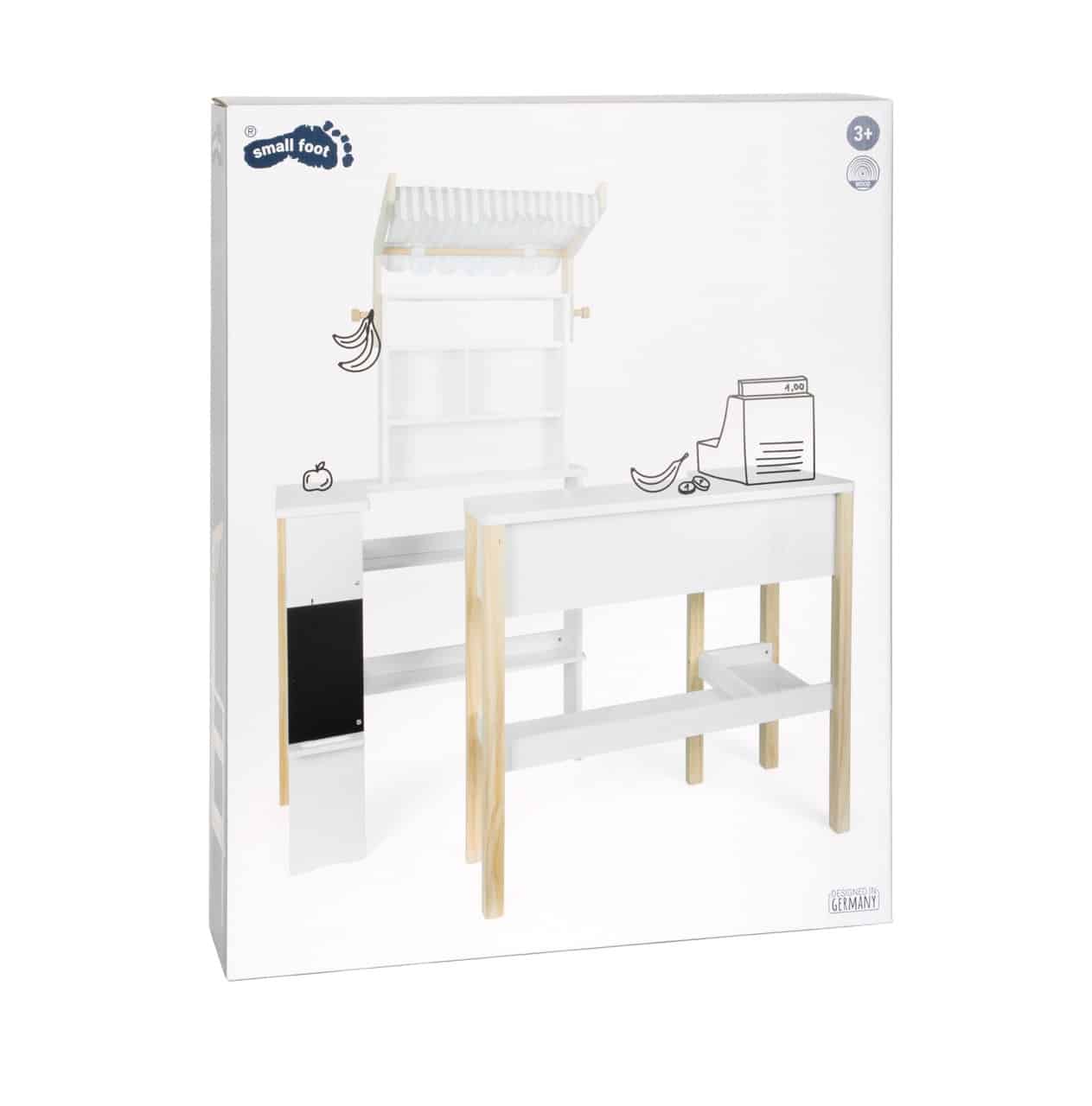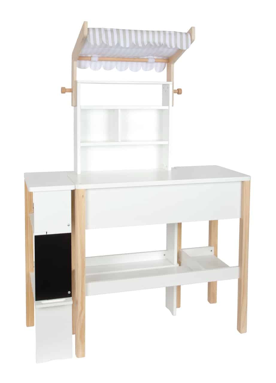 Willkommen in der Welt des Handels! Mit unserem kompakten Kaufladen „fresh“ aus Holz wird jedes Kinderzimmer zum lebhaften Marktplatz. Im modernen, schlichten Nord-Design gehalten, verbindet dieser charmante Kaufladen neutrales Weiß mit viel naturbelassenem Holz und fügt sich so stilvoll in jede Einrichtung ein. Ausgestattet mit einer abnehmbaren Stoffmarkise, einer beschreibbaren Angebotstafel und cleveren Stauraumlösungen, bietet er die perfekte Bühne für kreative Rollenspiele. Das Beste daran: Nach einem erfolgreichen Markttag lassen sich die modularen Elemente platzsparend zusammenschieben. Ein Traum für kleine Kaufleute und ordnungsliebende Eltern!