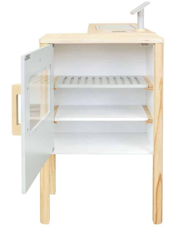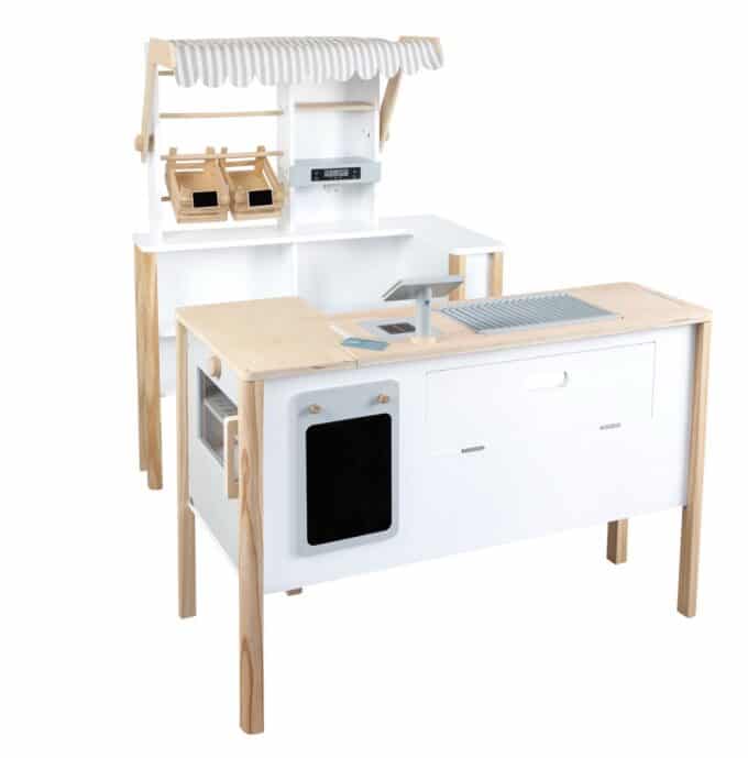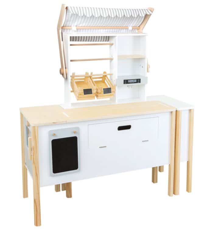 Eröffnen Sie ein Universum voller Fantasie und entdecken Sie ein Spielzeug, das so vielseitig ist wie die Träume Ihres Kindes! Unser 2-in-1-Wunder „fresh“ vereint das Beste aus zwei klassischen Rollenspielwelten: einen voll ausgestatteten Kaufladen und eine moderne Kinderküche. Ob als belebter Marktstand, schickes Kiosk, gemütlicher Imbiss oder kreative Gourmetküche – dieses modulare Spielcenter passt sich jeder Idee an. Im angesagten, nordischen Design mit viel sichtbarem Holz ist es nicht nur ein pädagogisch wertvolles Spielzeug, das zurecht die „spiel gut“-Auszeichnung trägt, sondern auch ein stilvoller Blickfang. Nach dem Spielen lassen sich die Elemente clever zusammenschieben, was „fresh“ zur perfekten Lösung für jedes Kinderzimmer macht.