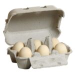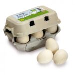 Inhalt: 6 Teile aus Holz zum Spielen – sechs weiße Eier in Eierbox mit schön gestaltetem Etikett. 3 Stück