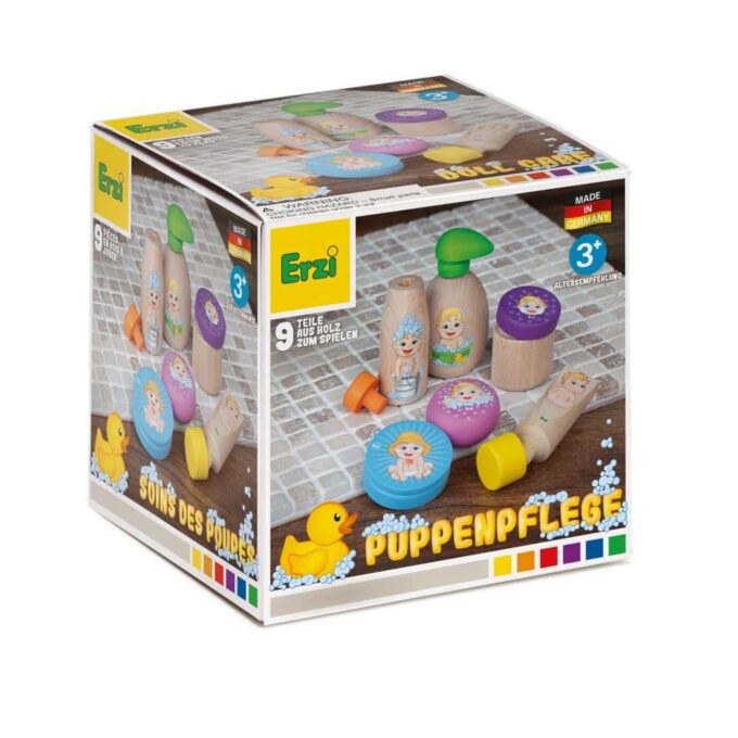 Inhalt: 9 Teile (davon 3 abnehmbare Deckel) aus Holz zum Spielen – 1 Seifenspender, 1 Haarwäsche, 1 Cremedose, 1 Cremetopf, 1 Cremetube, 1 Seifenstück – Eine Pflegeserie aus Holz, die einfach keiner Puppenmami fehlen darf. Hier ist wirklich alles drin, wonach Lieblingspüppchens Haut sich sehnt: Shampoo, Seife im Spender, Sonnencreme aus der Dose, Wundschutzcreme in der Tube, Creme fürs Gesicht aus dem Cremetopf und natürlich ein Stückchen Puppenseife. Mmmmmh… „riecht das gut“.